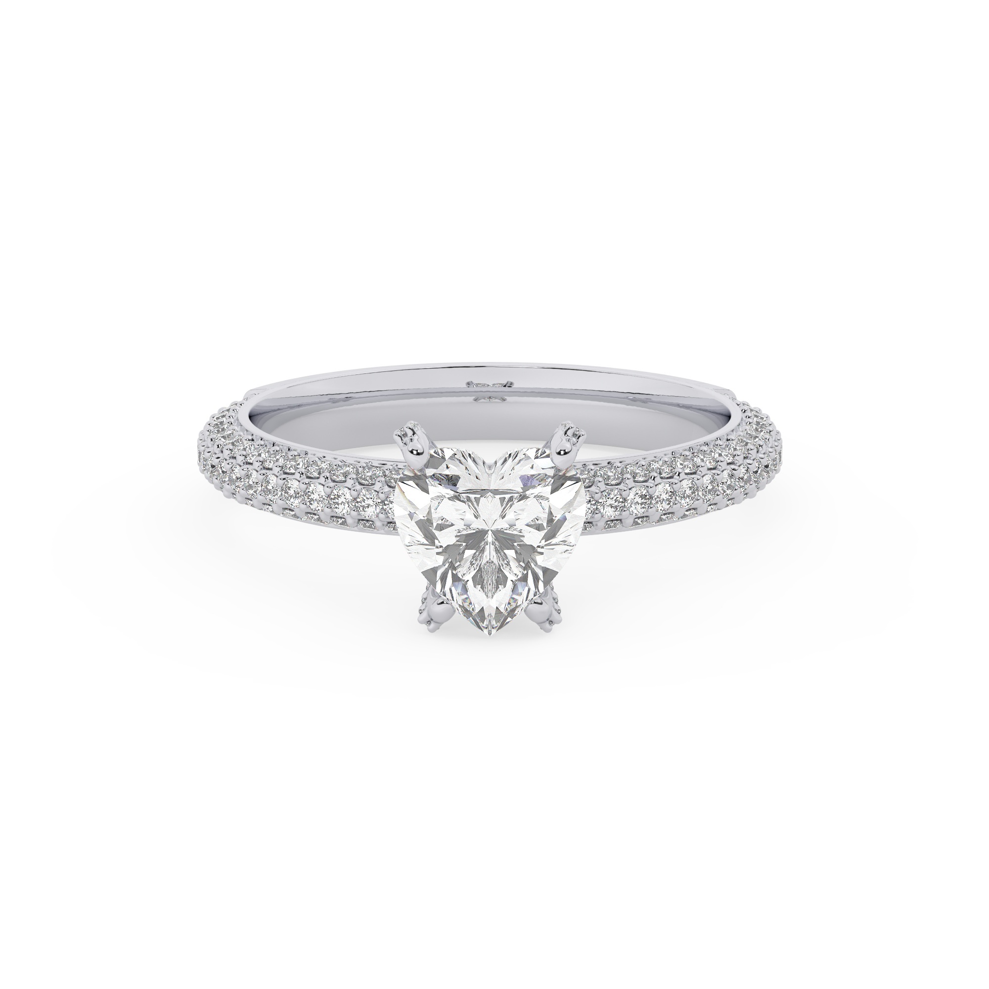 טבעת אירוסין סוליטר מהממת עשויה זהב לבן 14 קראט ומעוטרת ב-117 אבני זירקוניה נוצצות במשקל כולל של 1.90 קראט. האבן המרכזית בצורת לב שוקלת 1.50 קראט בגוון D ובניקיון VVS1.
