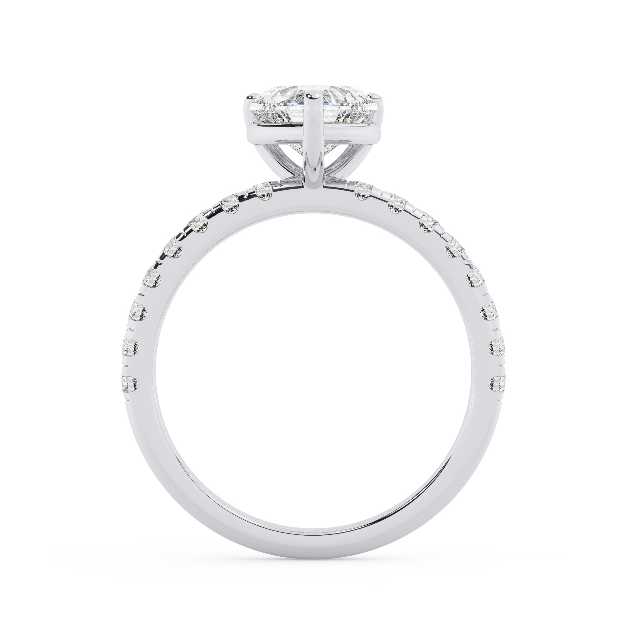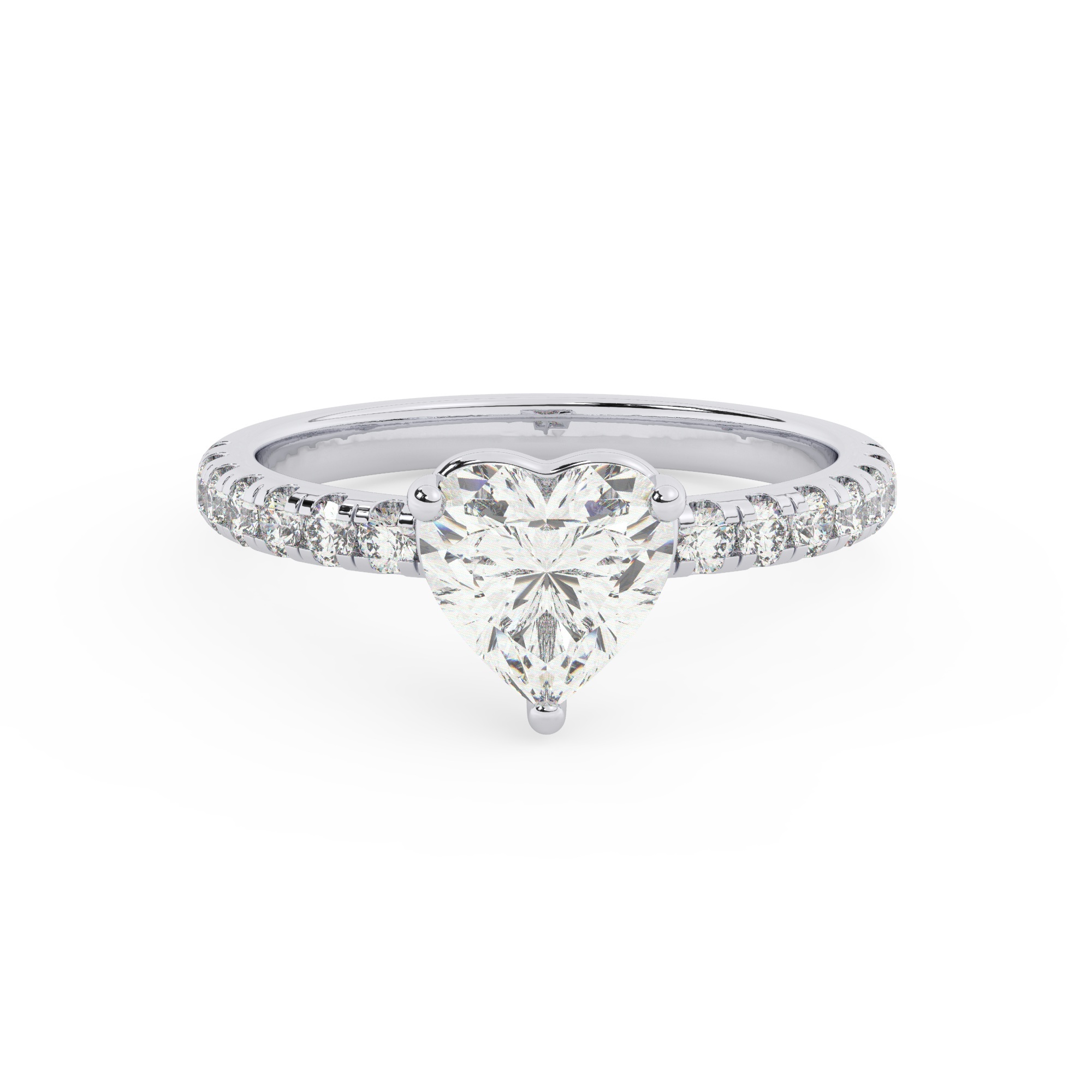 הזרז של הטבעת הזו היא האבן המרכזית – זירקוניה בצורת לב, בעלת משקל של 1.50 קראט. צבעה D ובהירותה VVS1 מבטיחים שהאבן לא רק תתפוס את העין, אלא גם תשדר איכות מצוינת ורמה גבוהה. בטבעת זו הושקעו 17 אבנים מבריקות, כולל 16 אבנים צדדיות מדגם זירקוניה קובית, שמוסיפות בעדינות לאווירה הכללית של הטבעת. משקל האבנים הצדדיות יחד הוא 0.32 קראט והן בעלות צבע D עם בהירות VVS1.