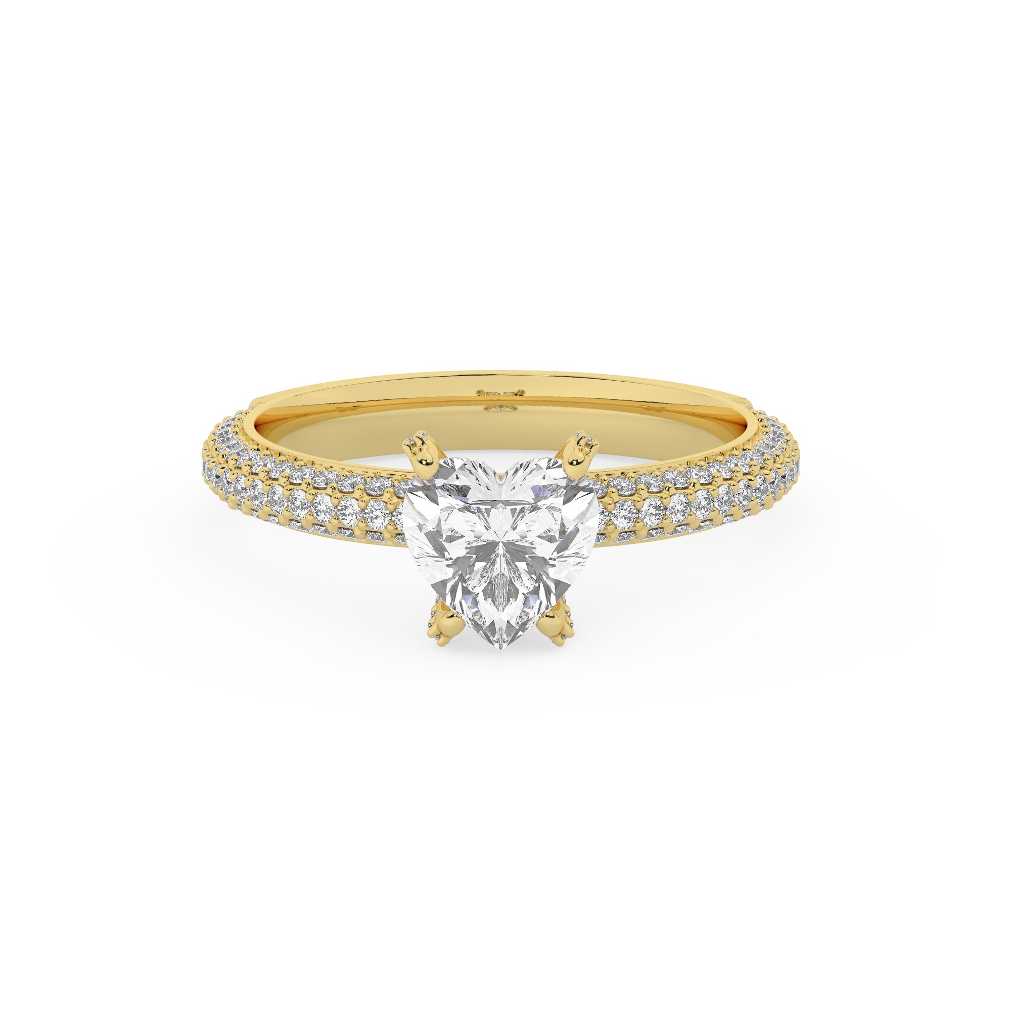 טבעת אירוסין סוליטר יוקרתית עשויה זהב צהוב 14 קראט, משובצת בזירקוניה בצורת לב במשקל 1.50 קראט ועוד 116 אבנים קטנות – סך כולל של 1.90 קראט. שילוב אלגנטי של עיצוב קלאסי עם נצנוץ עוצר נשימה.