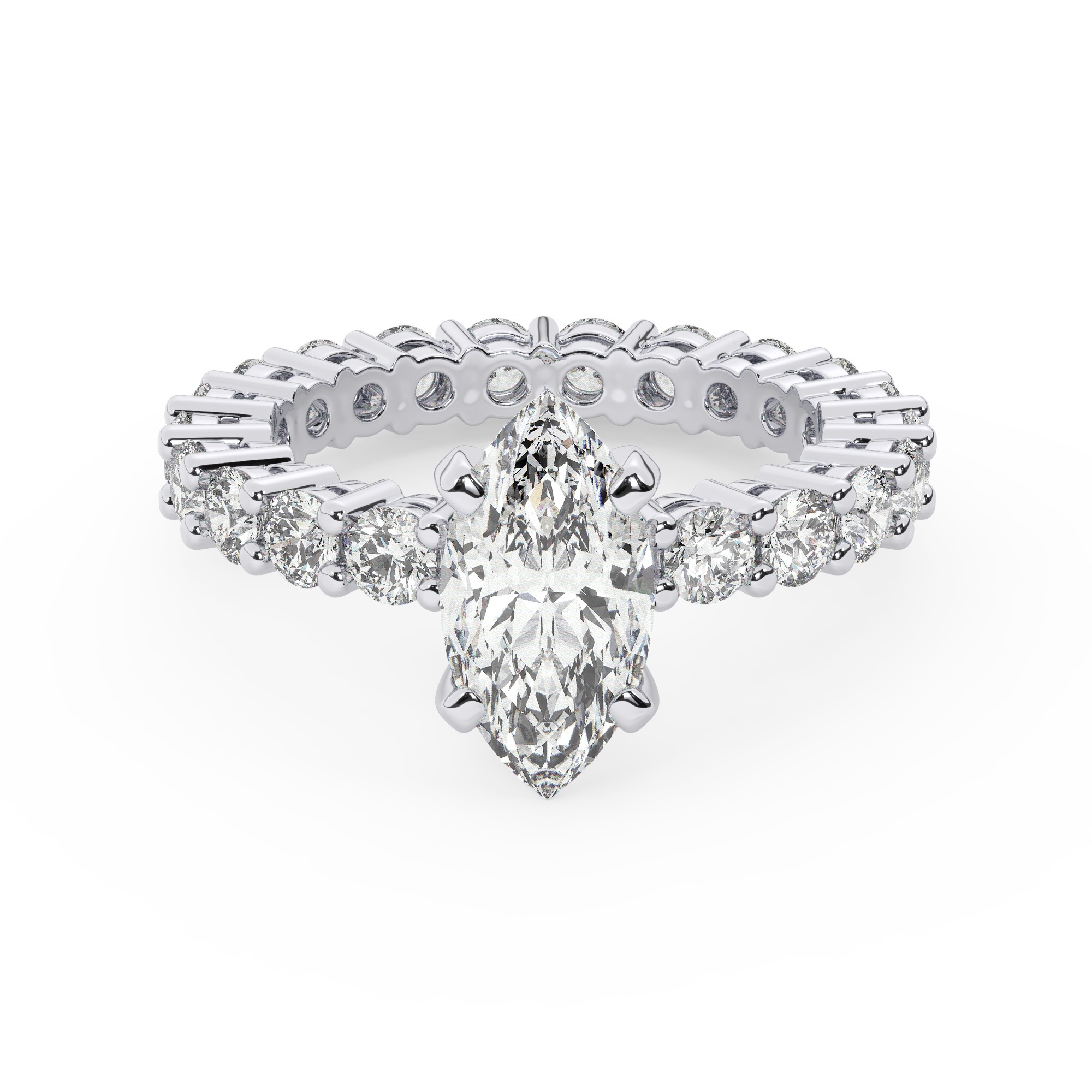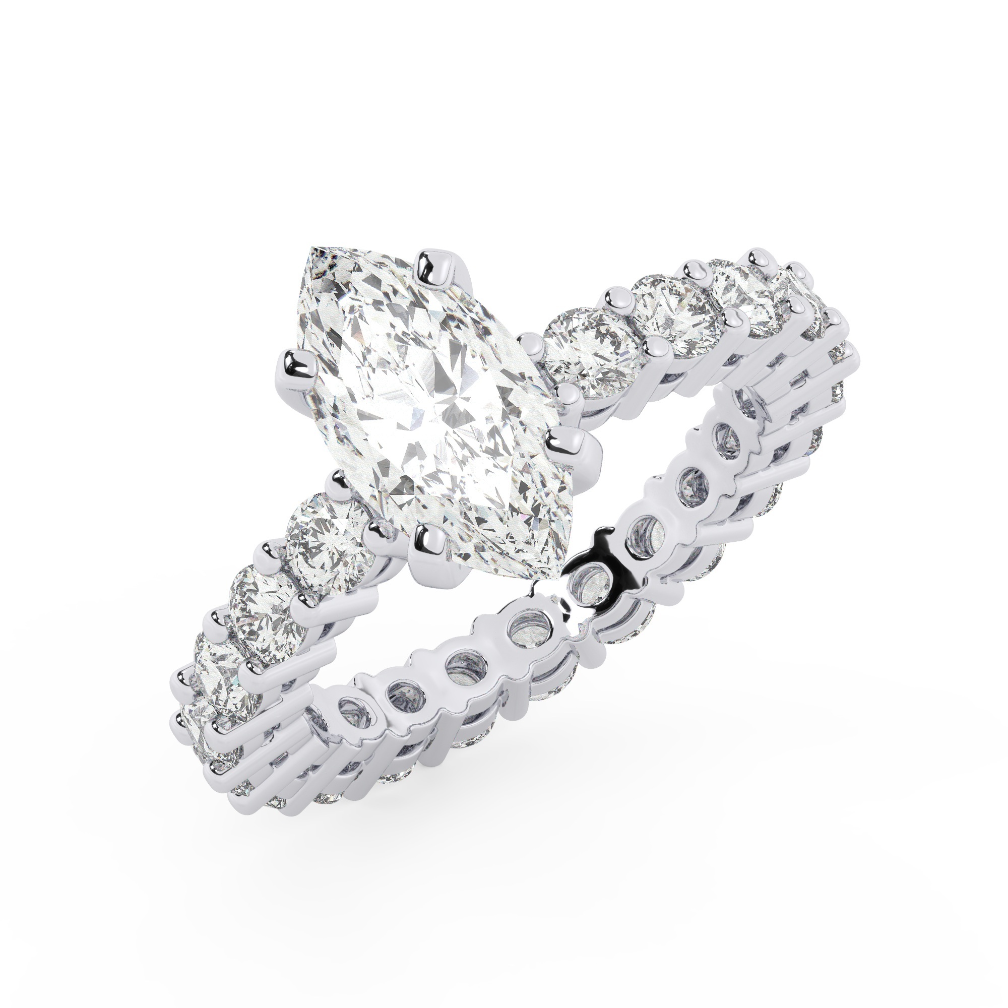 טבעת אירוסין סוליטר וזירקונים בצדדים איטרנטיני דגם 50044 זהב לבן 14 קראט במרכז זירקוניה 0.50 קראט בחיתוך מרקיזה מסביב ובצדדים זירקונים בחיתוך עגול