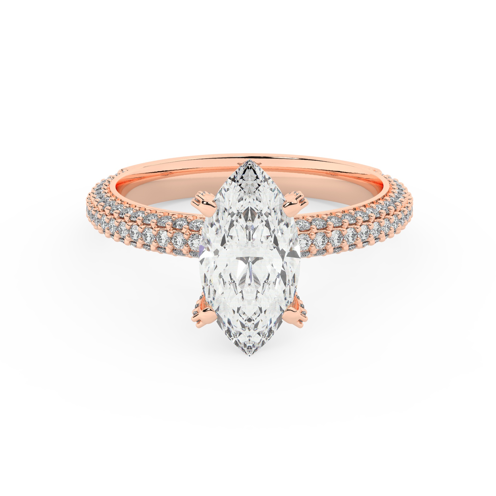 טבעת אירוסין סוליטר ויהלומים בצדדים דגם 50012 זהב אדום רוזגולד 14 קראט במרכז זירקוניה 1 קראט בחיתוך מרקיזה מסביב ובצדדים זירקונים בחיתוך עגול