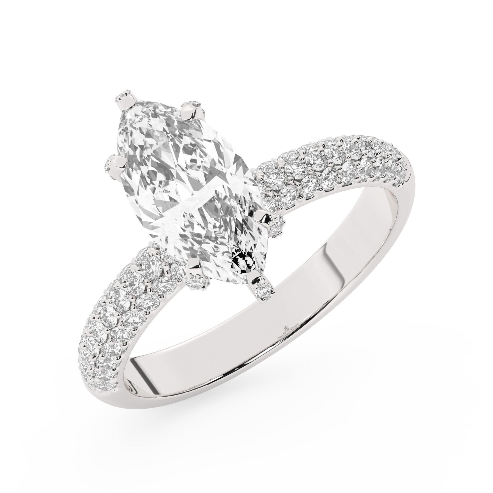 טבעת אירוסין מרהיבה בסגנון סוליטר עם יהלומים בצדדים, עשויה מזהב לבן 14 קראט ומשובצת 101 אבני זירקוניה נוצצות במשקל כולל של 2 קראט, עם אבן מרכזית מרשימה בצורת מרקיזה במשקל 1.50 קראט, דרגת ניקיון VVS1 וצבע D.