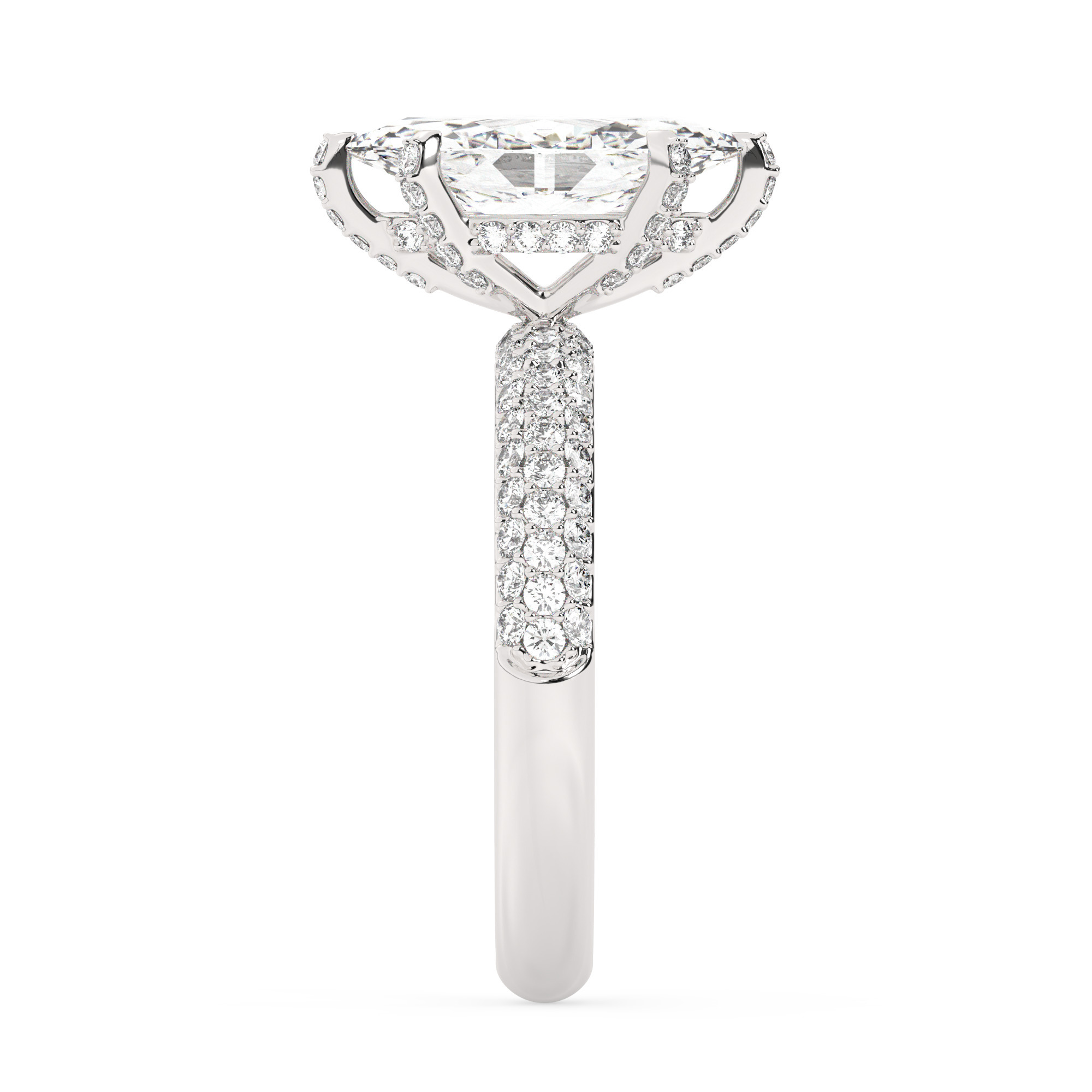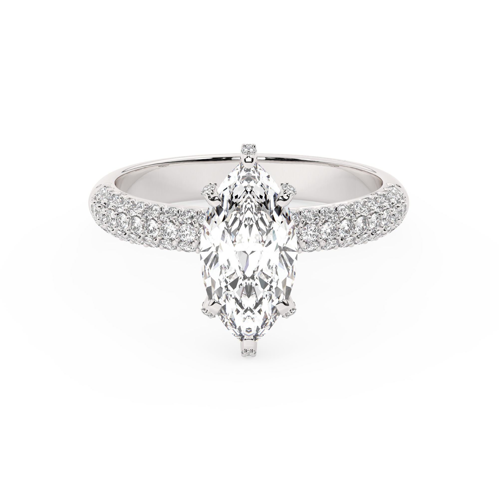טבעת אירוסין יוקרתית בסגנון סוליטר, משובצת ב-101 אבני זירקוניה נוצצות במשקל כולל של 4.50 קרט. האבן המרכזית, מרקיזה 4 קרט בצבע D ונקיון VVS1, שוכנת בגוף טבעת מכסף מצופה זהב לבן בעיצוב אלגנטי ועכשווי.