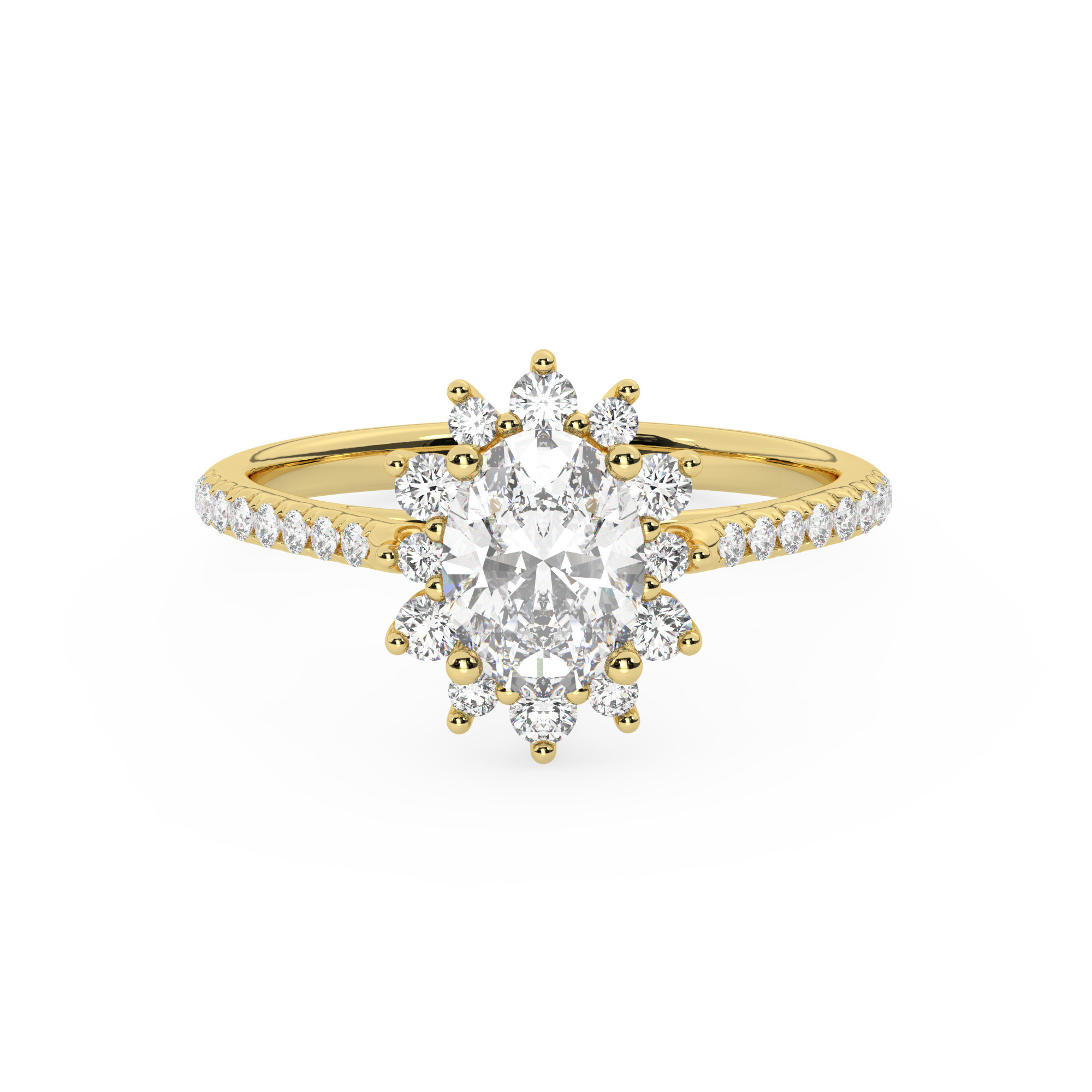 טבעת אירוסין היילו דגם 50024 זהב צהוב 14 קראט במרכז זירקוניה 0.50 קראט בחיתוך אובל מסביב ובצדדים זירקונים בחיתוך עגול