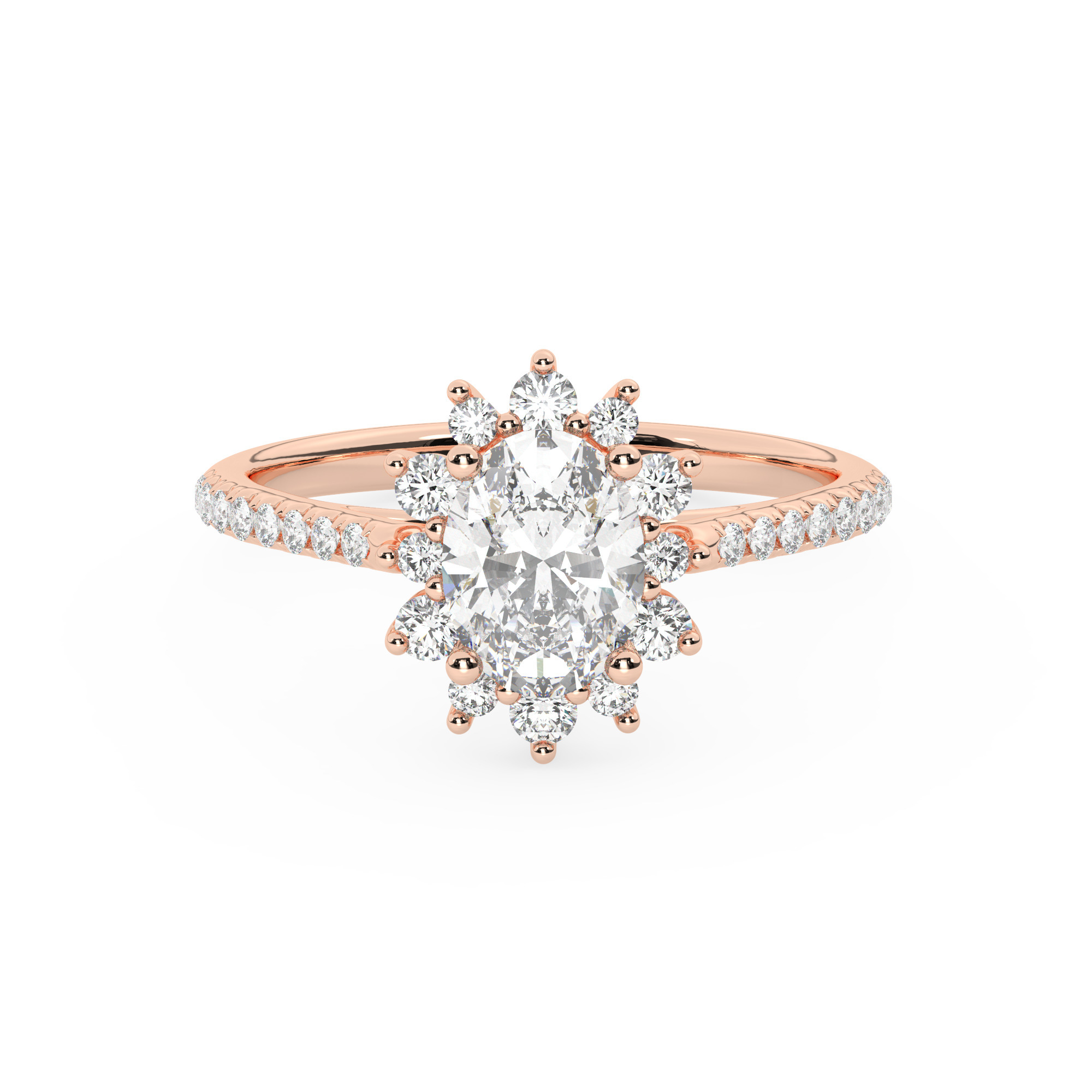 טבעת אירוסין היילו דגם 50024 זהב אדום רוזגולד 14 קראט במרכז זירקוניה 1 קראט בחיתוך אובל מסביב ובצדדים זירקונים בחיתוך עגול
