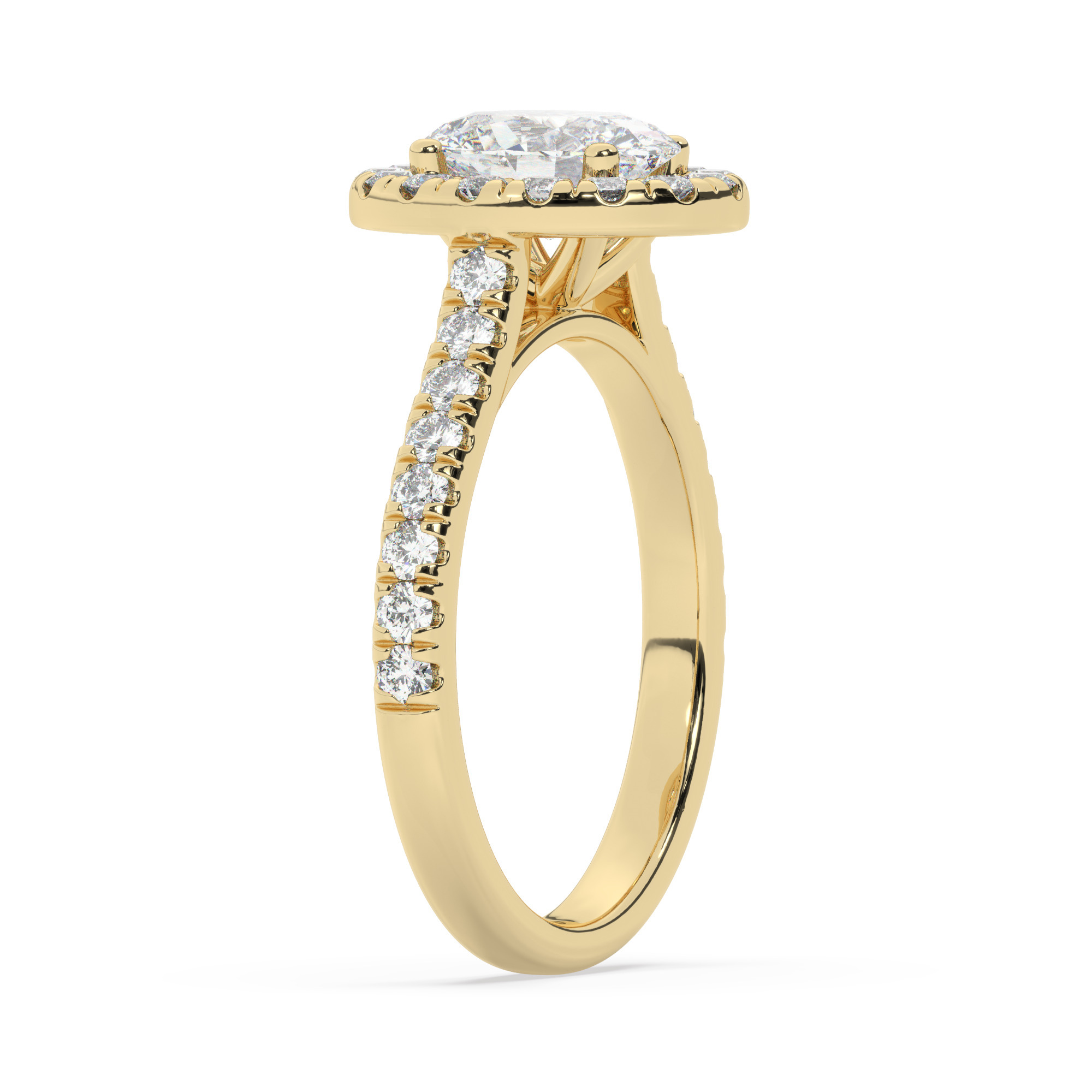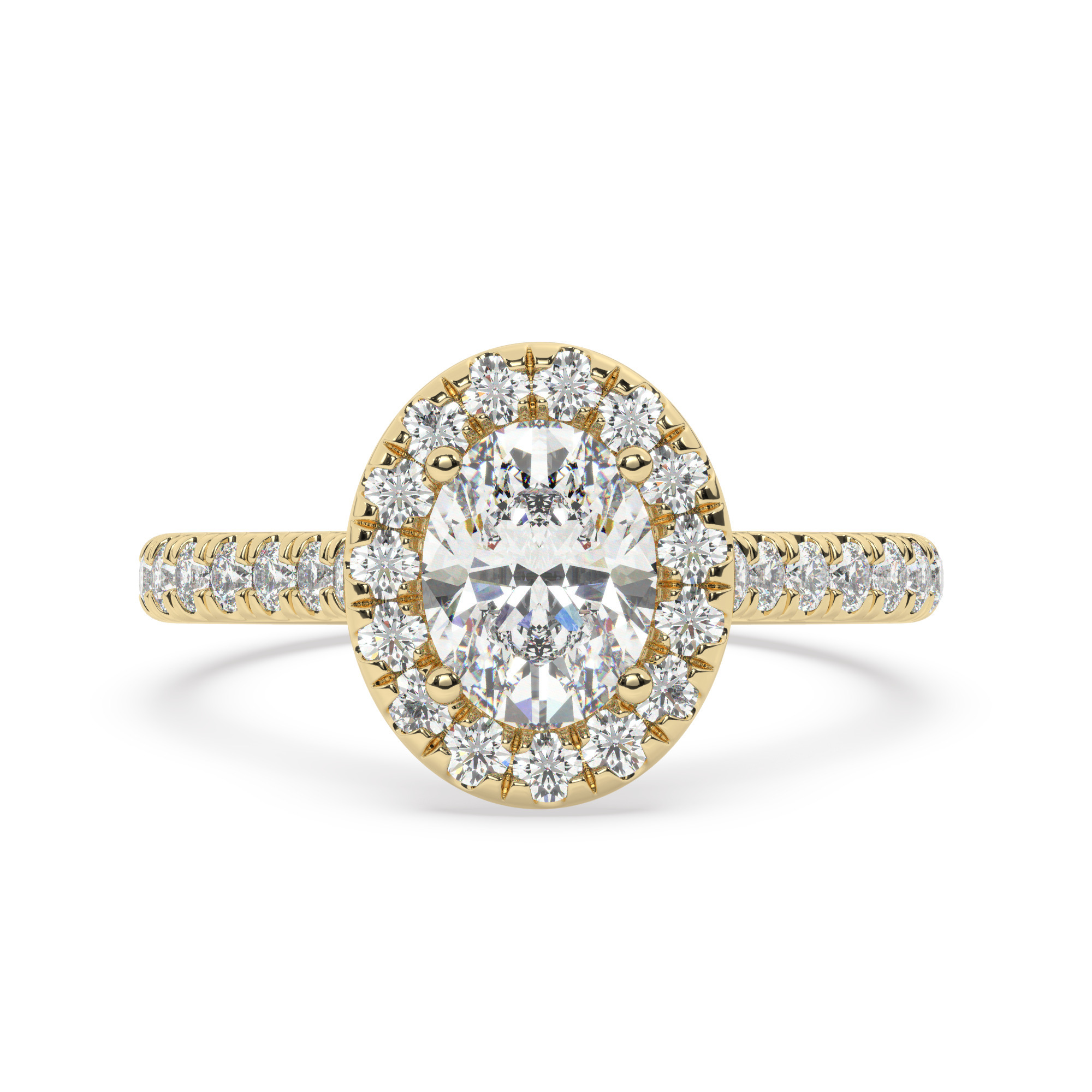 טבעת אירוסין היילו דגם 50026 זהב צהוב 14 קראט במרכז זירקוניה 1 קראט בחיתוך אובל מסביב ובצדדים זירקונים בחיתוך עגול