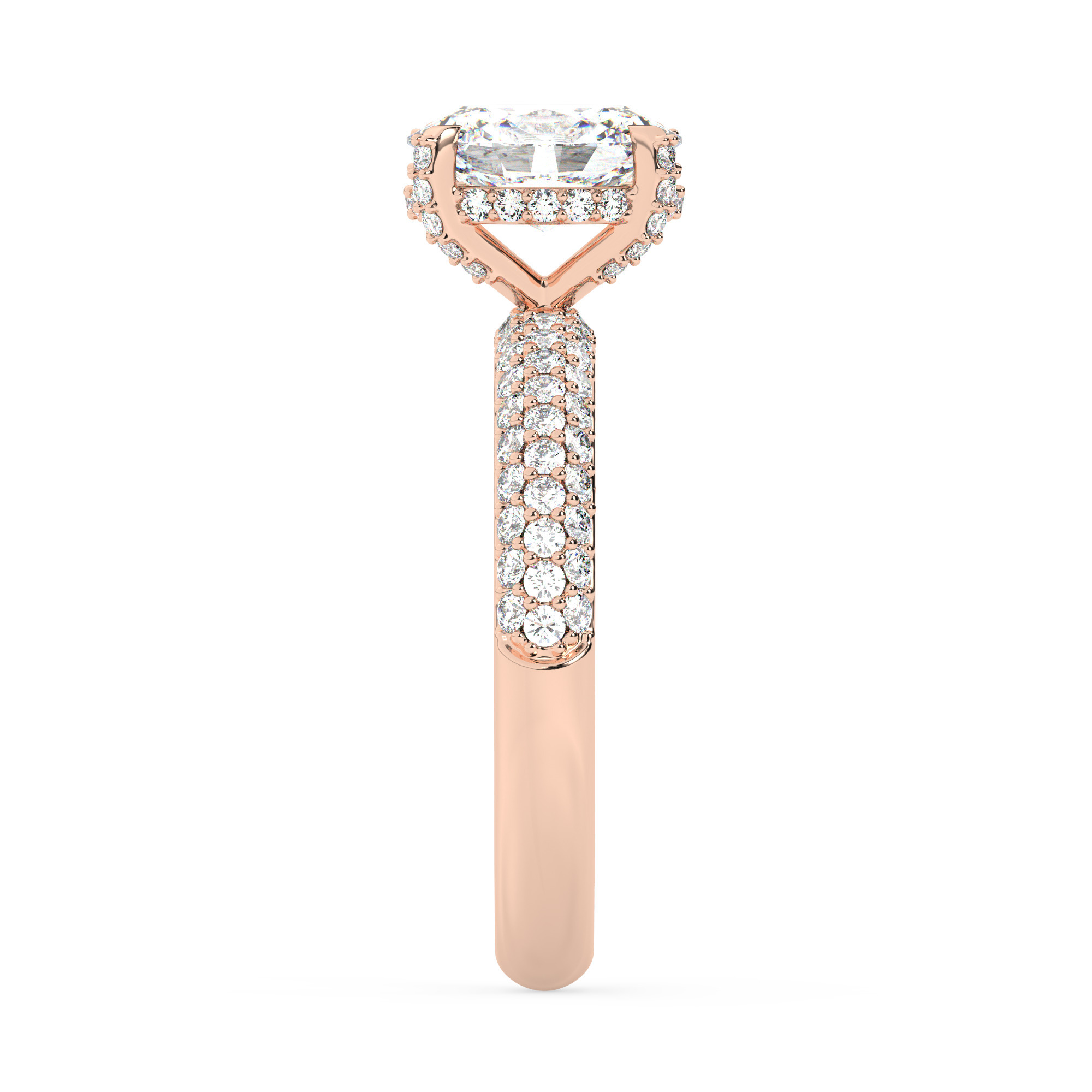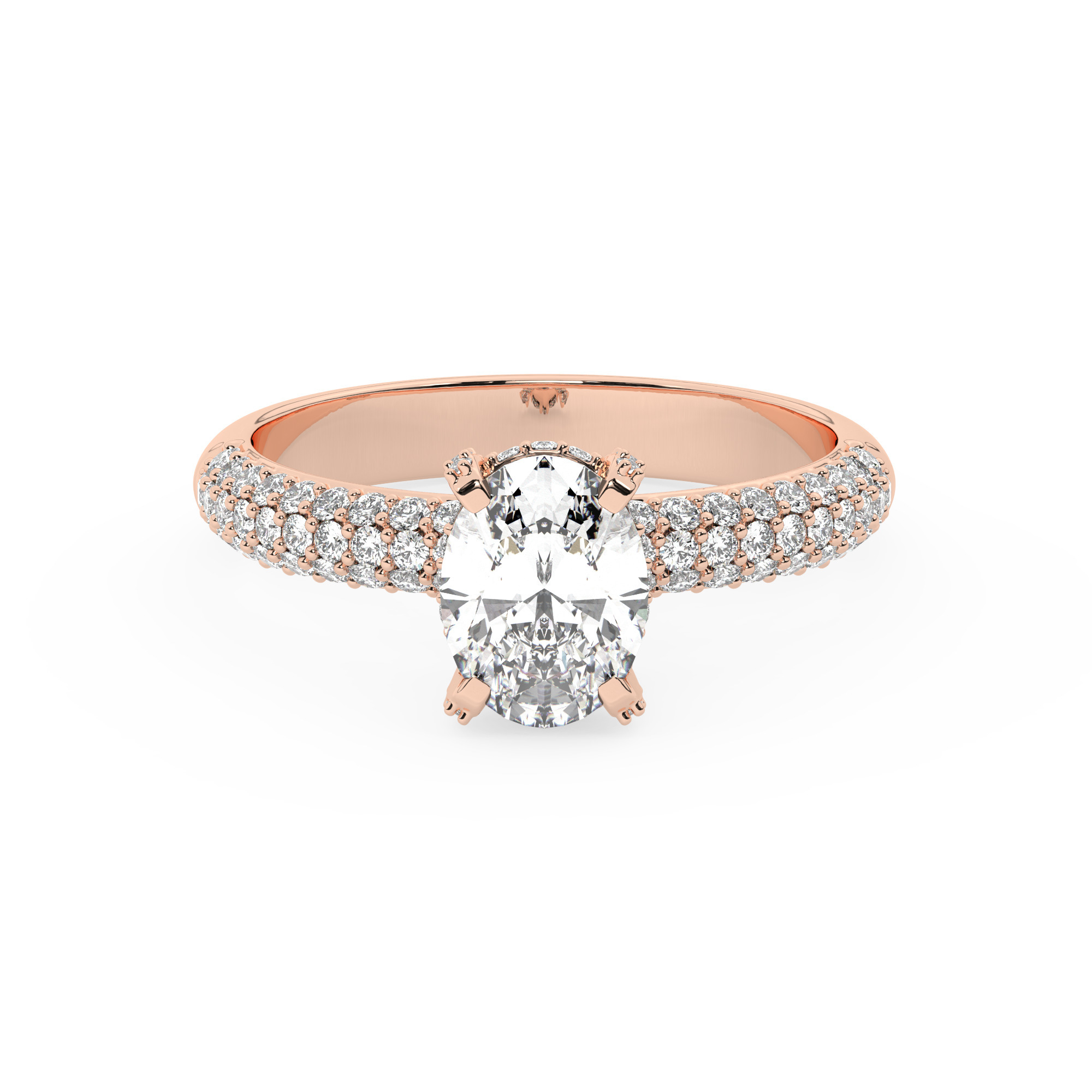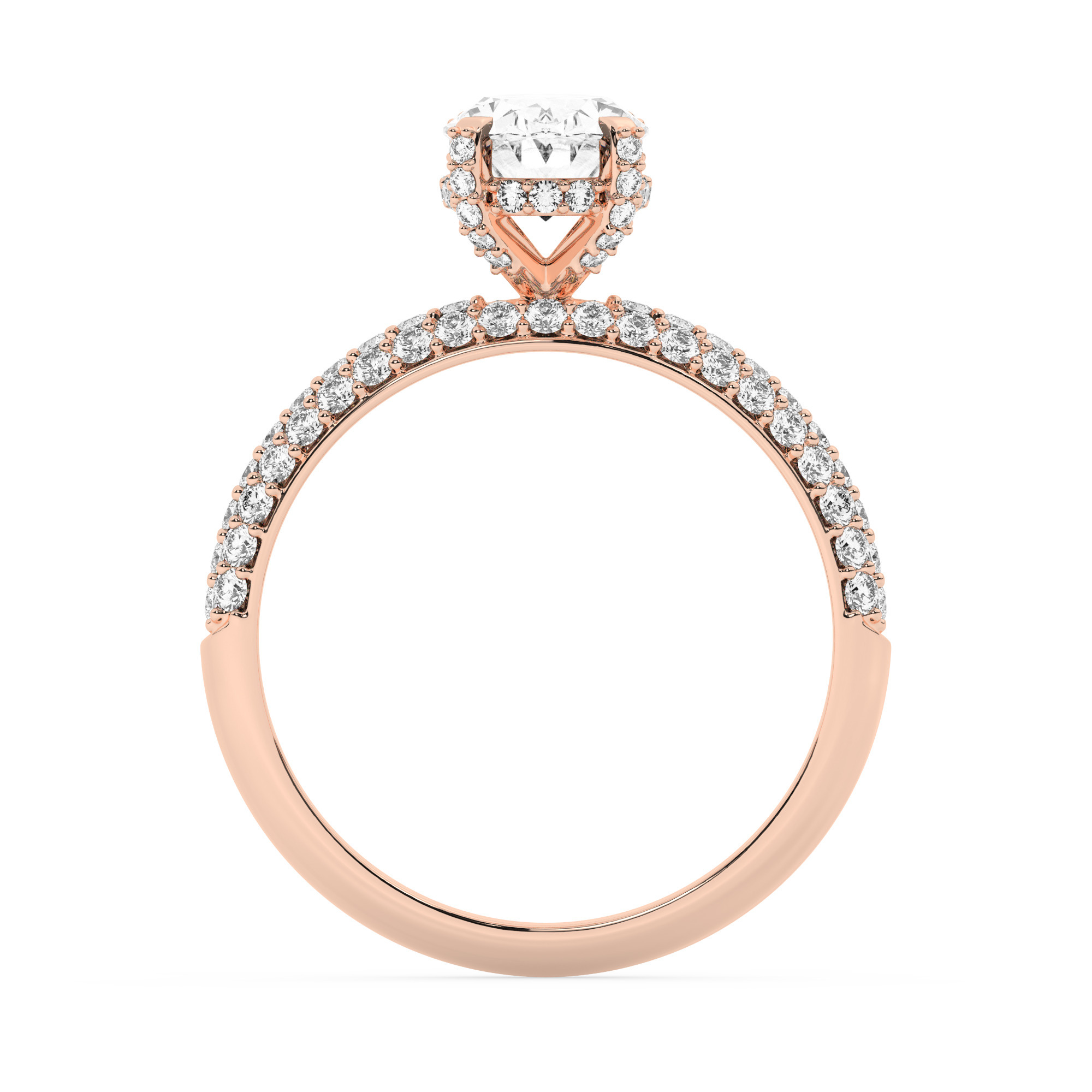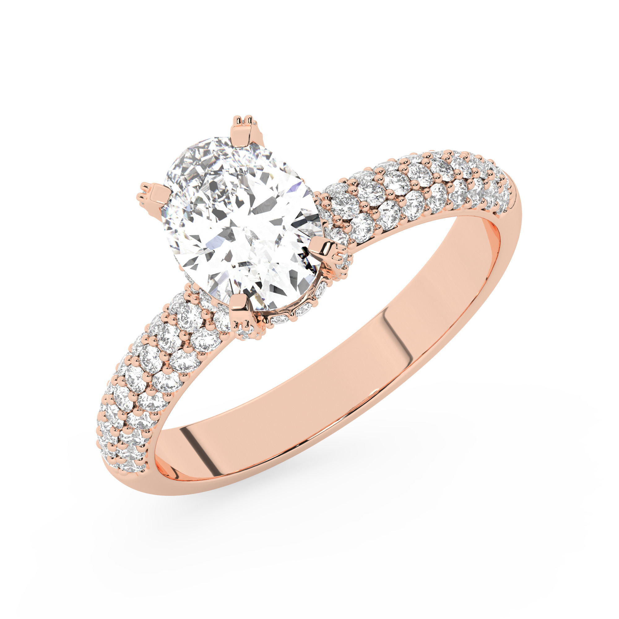 טבעת אירוסין סוליטר יוקרתית עם אבן מרכזית אובלית מרהיבה במשקל קרט אחד, מוקפת ב-100 אבני זירקוניה בוהקות. עשויה מכסף מצופה זהב אדום (רוזגולד), בעיצוב קלאסי ונשי המשדר יוקרה ונצחיות.