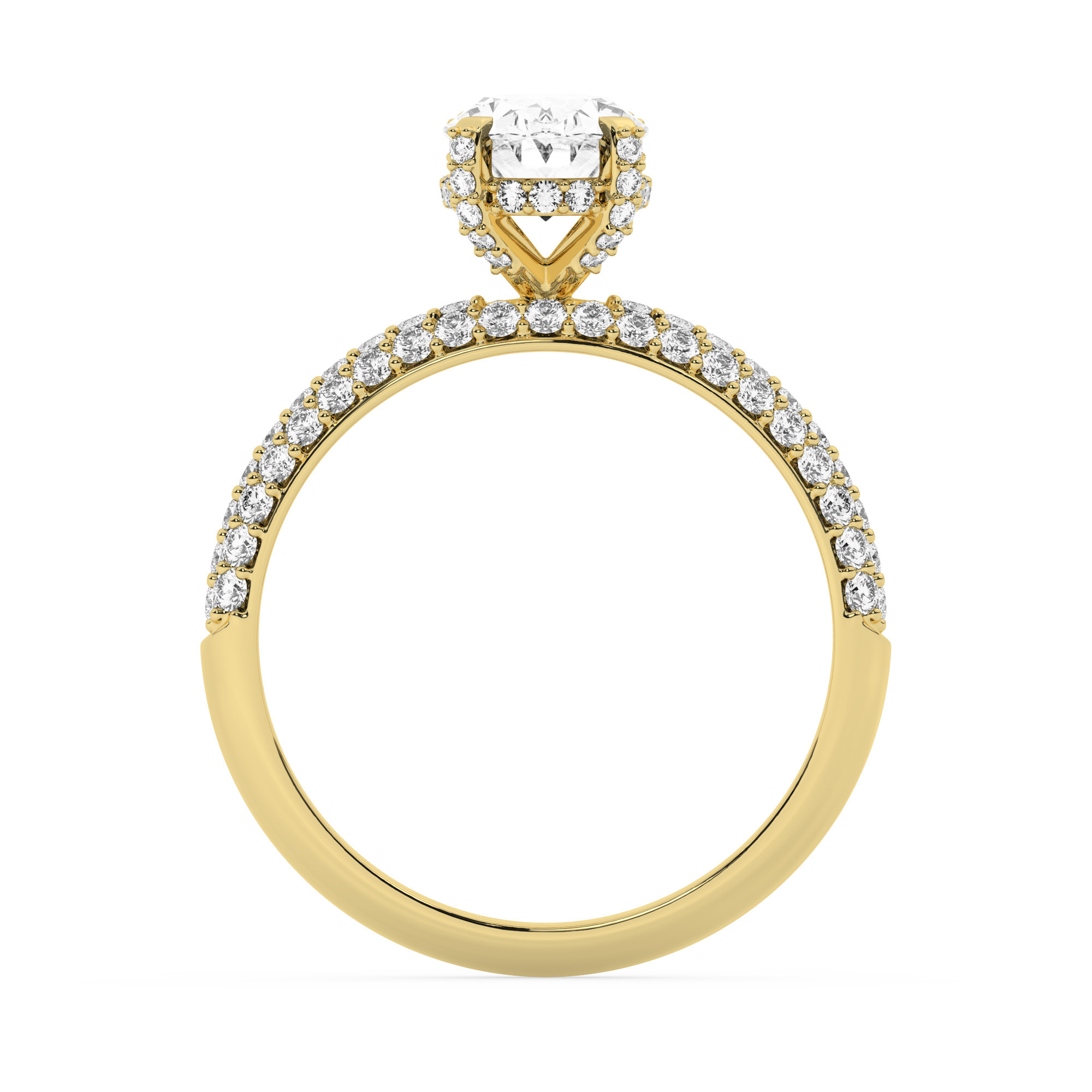 טבעת אירוסין סוליטר מרהיבה בזהב צהוב 14 קראט עם אבן מרכזית זירקוניה אובלית במשקל 1.50 קראט ו-100 יהלומים קטנים בצדדים במשקל כולל של 2 קראט. עיצוב קלאסי ואלגנטי עם תעודה גמולוגית.