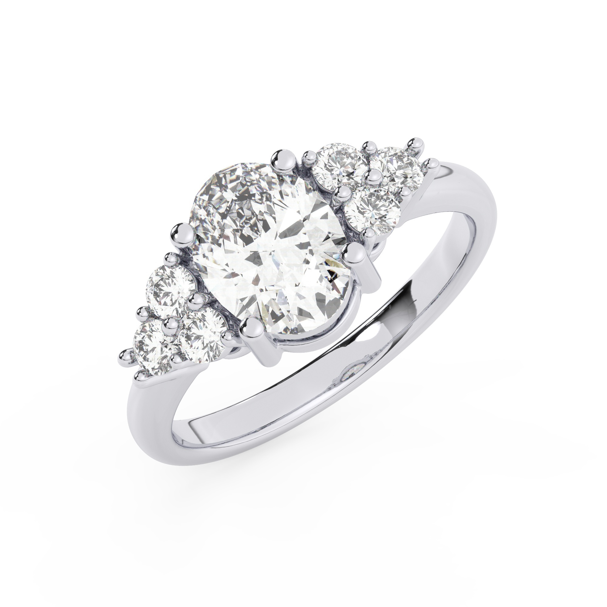 טבעת אירוסין סוליטר וזירקונים בצדדים דגם 50041 כסף מצופה זהב לבן במרכז זירקוניה 1.50 קראט בחיתוך אובל מסביב ובצדדים זירקונים בחיתוך עגול