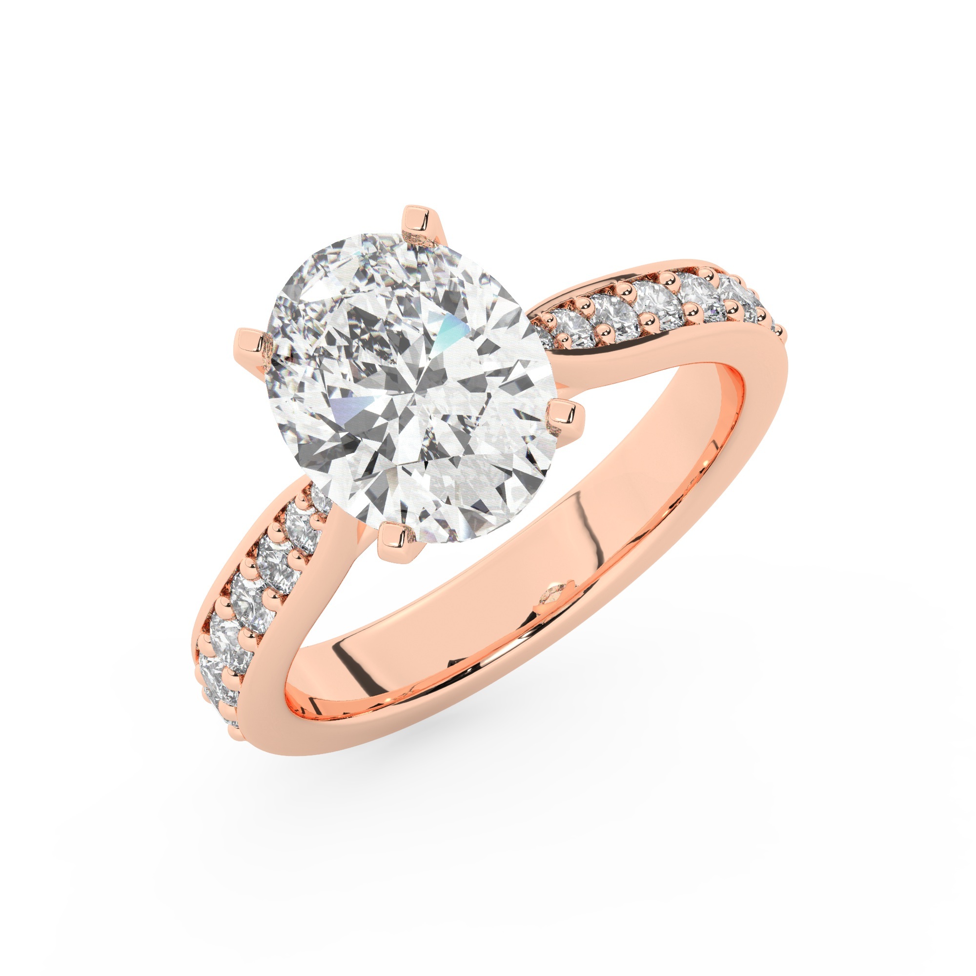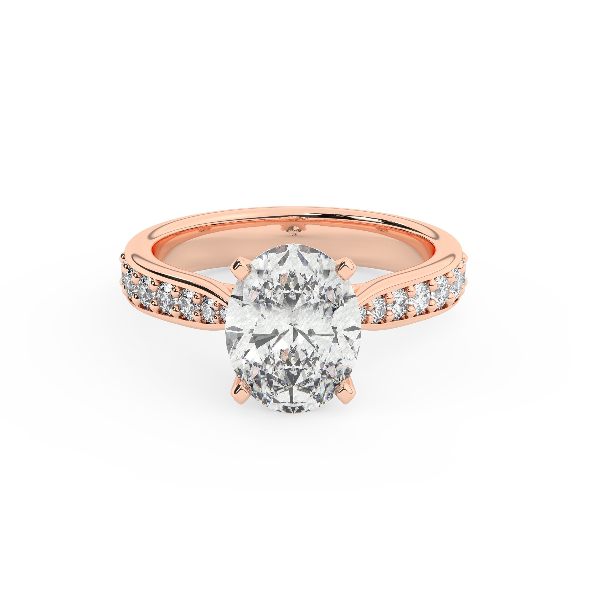 טבעת אירוסין סוליטר וזירקונים בצדדים דגם 50017 זהב אדום רוזגולד 14 קראט במרכז זירקוניה 2 קראט בחיתוך אובל מסביב ובצדדים זירקונים בחיתוך עגול