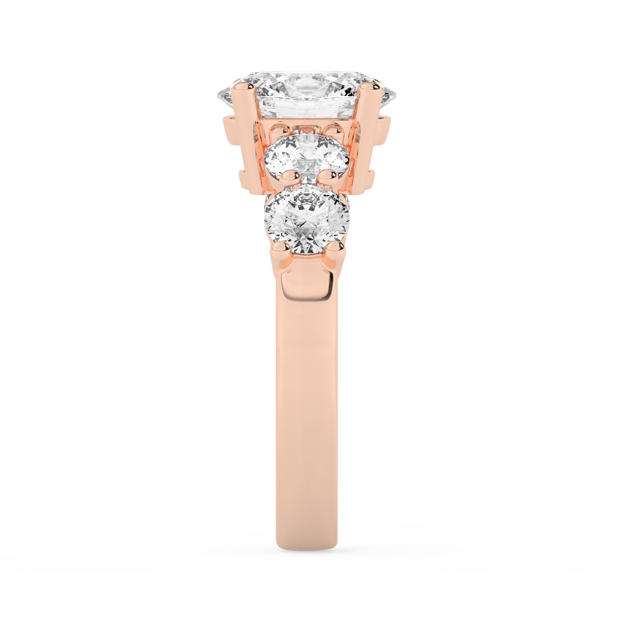 במרכז הטבעת אבן זירקוניה אובלית במשקל 2 קרט, המציעה צבע D ובהירות VVS1, מעידים על רמת איכות בלתי מתפשרת. כל קו וקו של האבן המרכזית מלווה בארבעה אבני צד עגולות המוסיף לעיצוב ככלל עומק ויוקרה. האבנים הצדדיות, עם משקל כולל של 1.08 קרט, מחוותות לאבן הראשית במקצועיות ועיצוב מעולה אשר גורם לערך כלל התכשיט להתעצם.