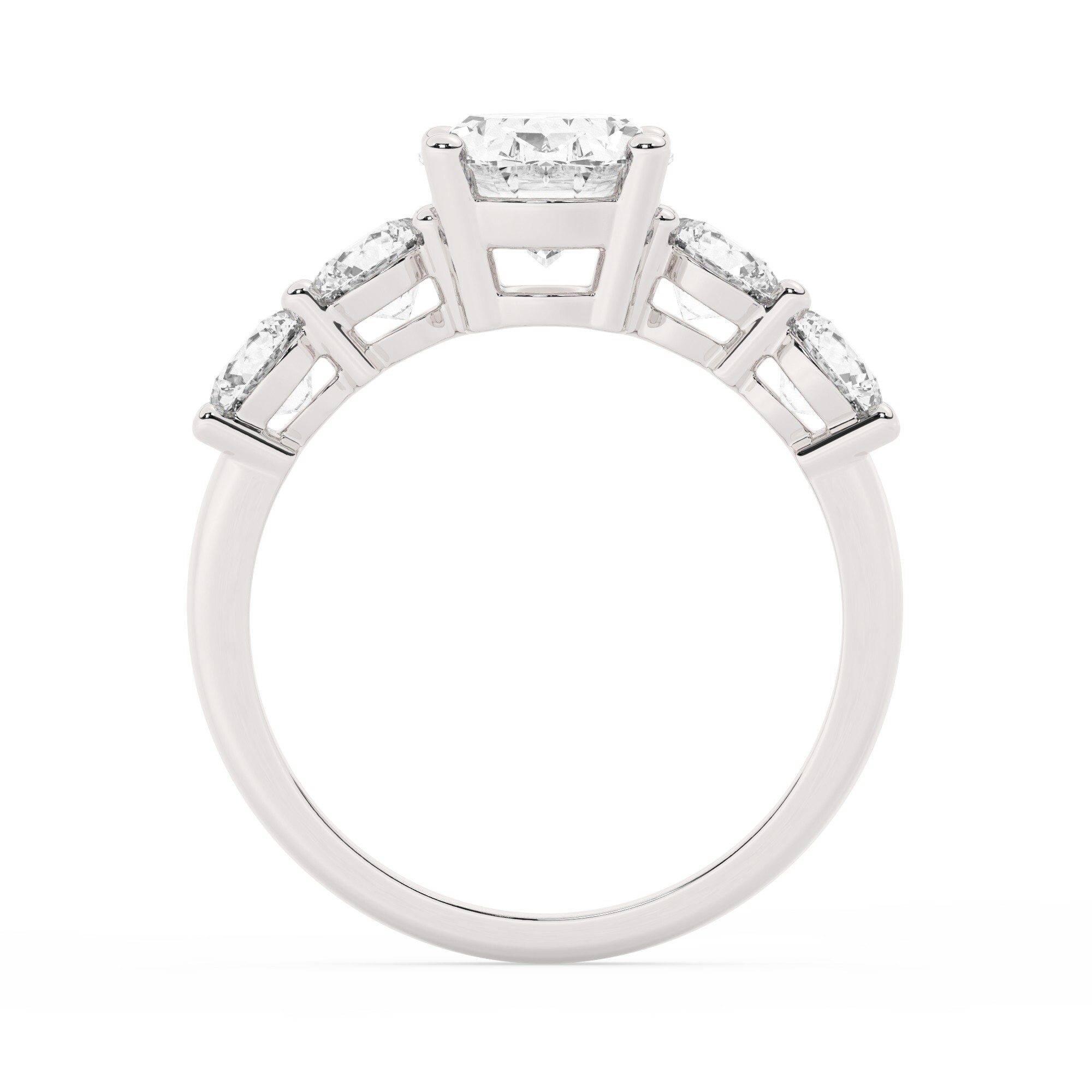 בצדדים של האבן המרכזית, הוספנו ארבע אבני זירקוניה נוספות, כל אחת במשקל 1.08 קארט, בצורת עגול, כך שהטבעת מוסיפה זוהר שמעיף את המראה כלפי מעלה. כל האבן היא באיכות גבוהה, צבע D וברק VVS1, מה שמבטיח שכל מי שיראה את טבעת האירוסין הזו יתמכר לפאר שלה. כל פרט בטבעת הללו מעוצב במיקוד על איכות, מה שמקנה לה אופי ייחודי וגרם לה להיות מוצר סופר-מעניין באוסף שלנו.