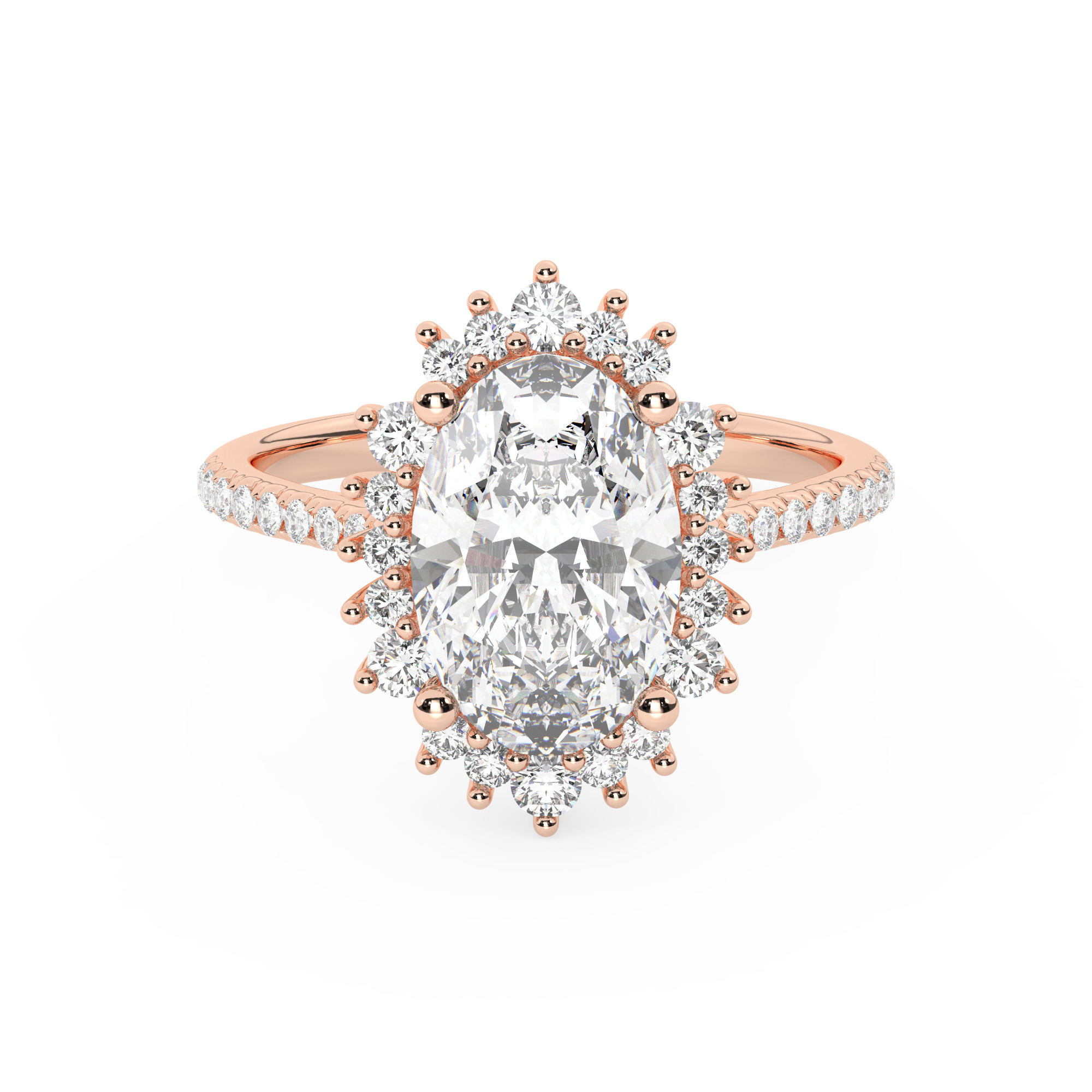 טבעת אירוסין היילו דגם 50024 זהב אדום רוזגולד 14 קראט במרכז זירקוניה 3 קראט בחיתוך אובל מסביב ובצדדים זירקונים בחיתוך עגול