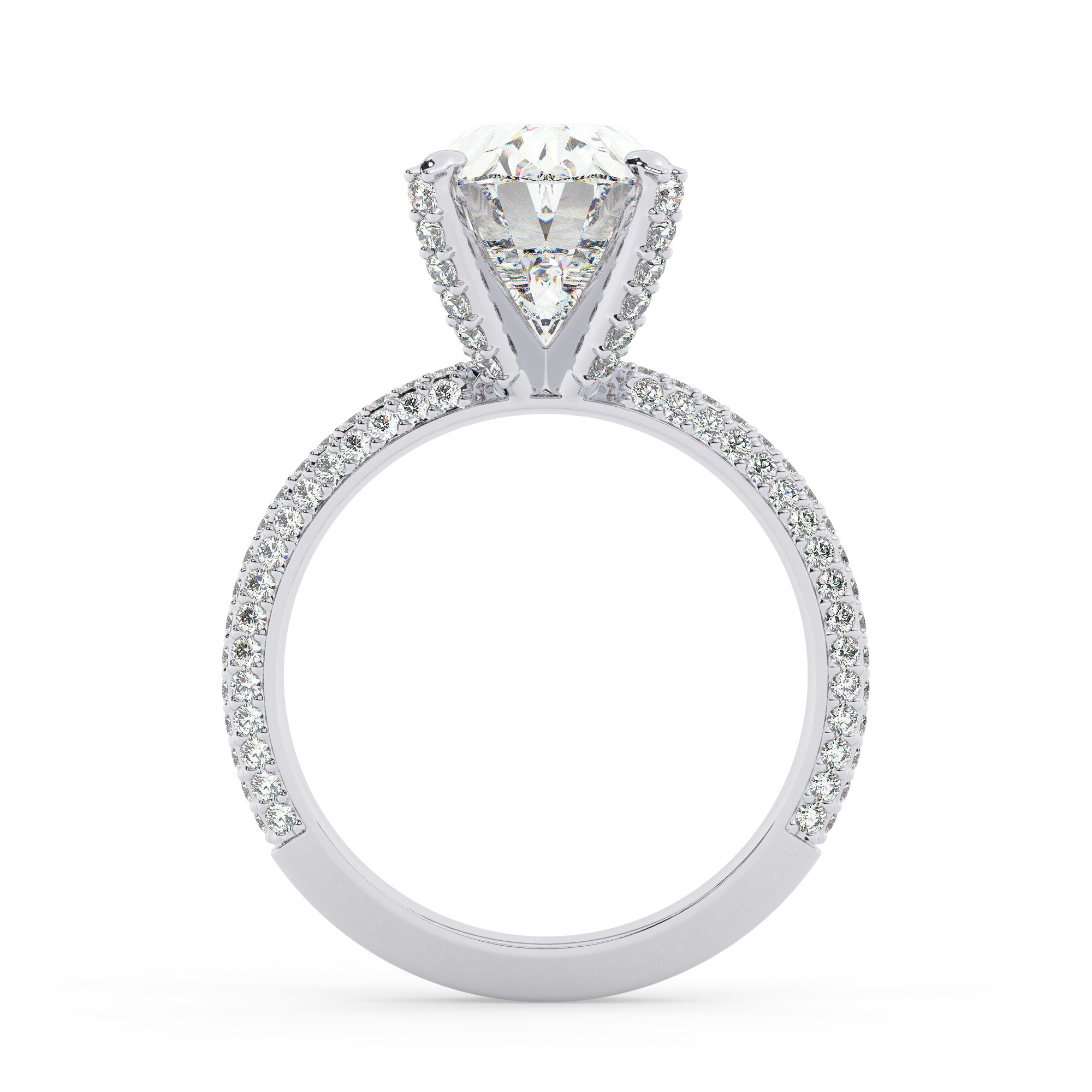 טבעת אירוסין יוקרתית בסגנון סוליטר עם יהלומים בצדדים, עשויה זהב לבן 14 קראט ומעוטרת ב-117 אבני זירקוניה במשקל כולל של 3.40 קראט. אבן מרכזית מרשימה במשקל 3 קראט בצורת אובל, צבע D וניקיון VVS1.