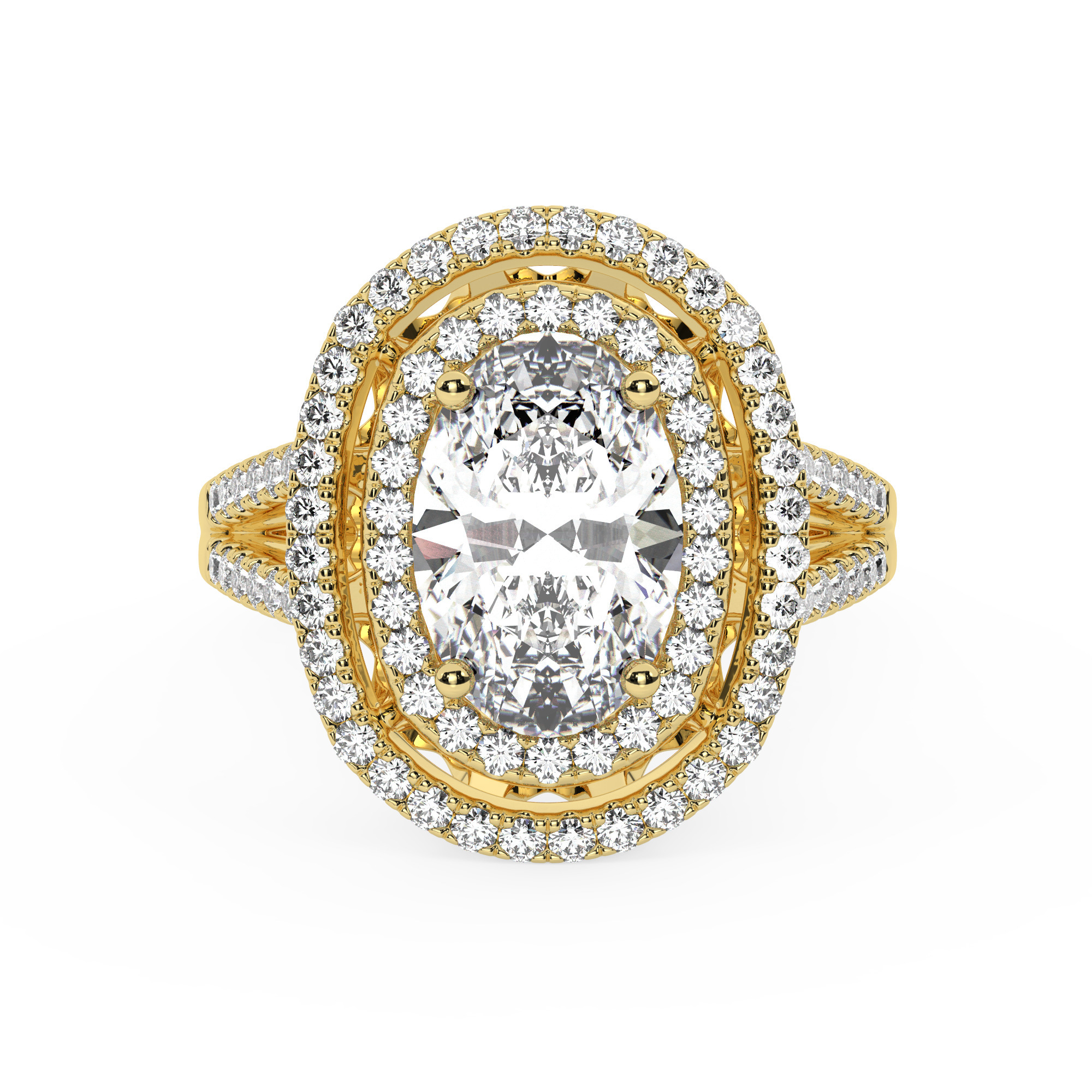מיוצרת מזהב צהוב 14 קראט, הטבעת לא רק מכילה את כלל האבנים המופלאות אלא גם שנבחרו בקפידה באיכות הגבוהה ביותר. 77 אבני זירקוניה עוטפות את האבן המרכזית המבריקה, במשקל כולל של 3.62 קראט. האבן המרכזית, בזירקוניה באיכות VVS1 ובצבע D, ממשיכה להיות מוקד של תשומת לב וזוהר, כשהצורה האובלית שלה מוסיפה אלגנטיות נוספת לטבעת.