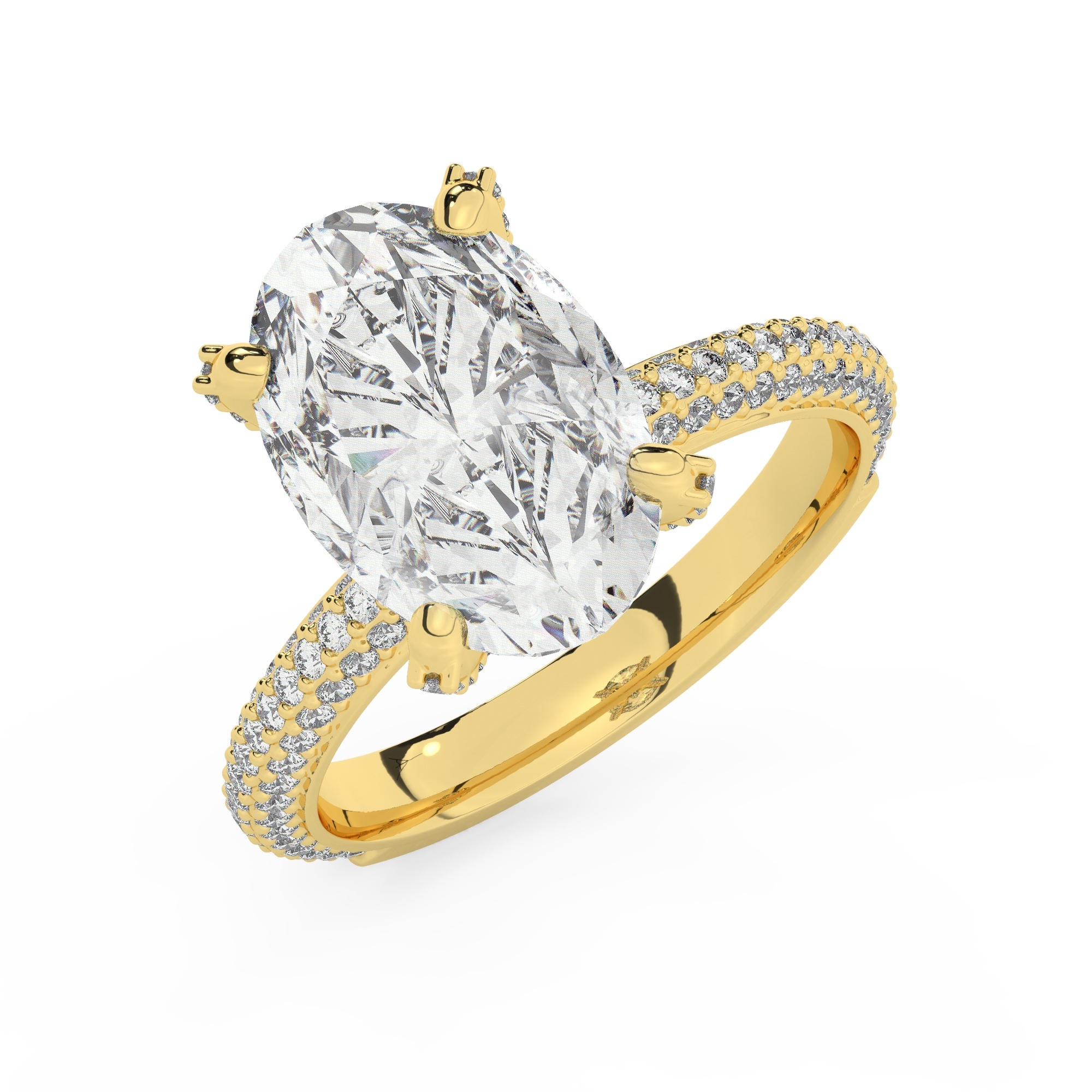 טבעת אירוסין סוליטר ויהלומים בצדדים דגם 50012 כסף מצופה זהב צהוב במרכז זירקוניה 3 קראט בחיתוך אובל מסביב ובצדדים זירקונים בחיתוך עגול
