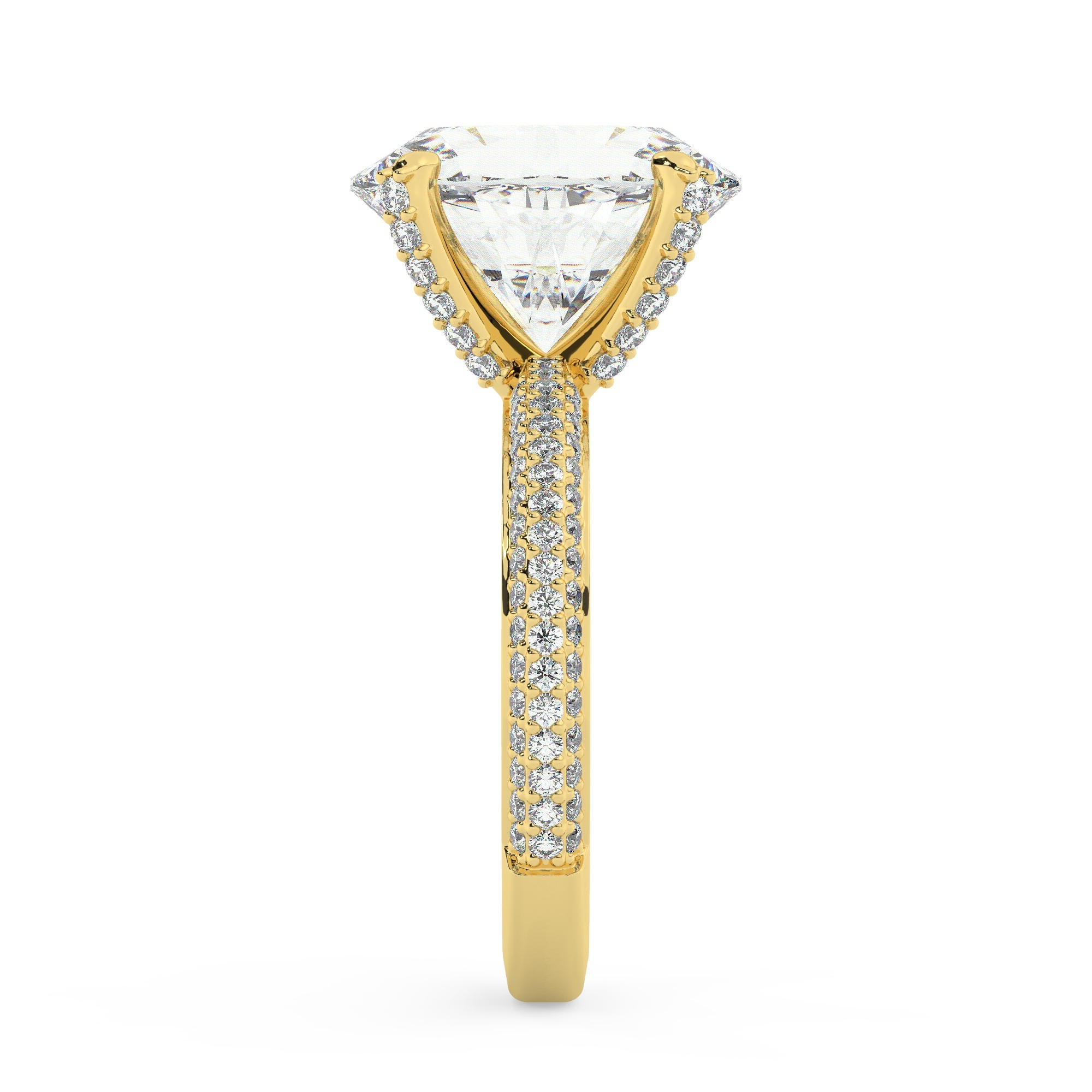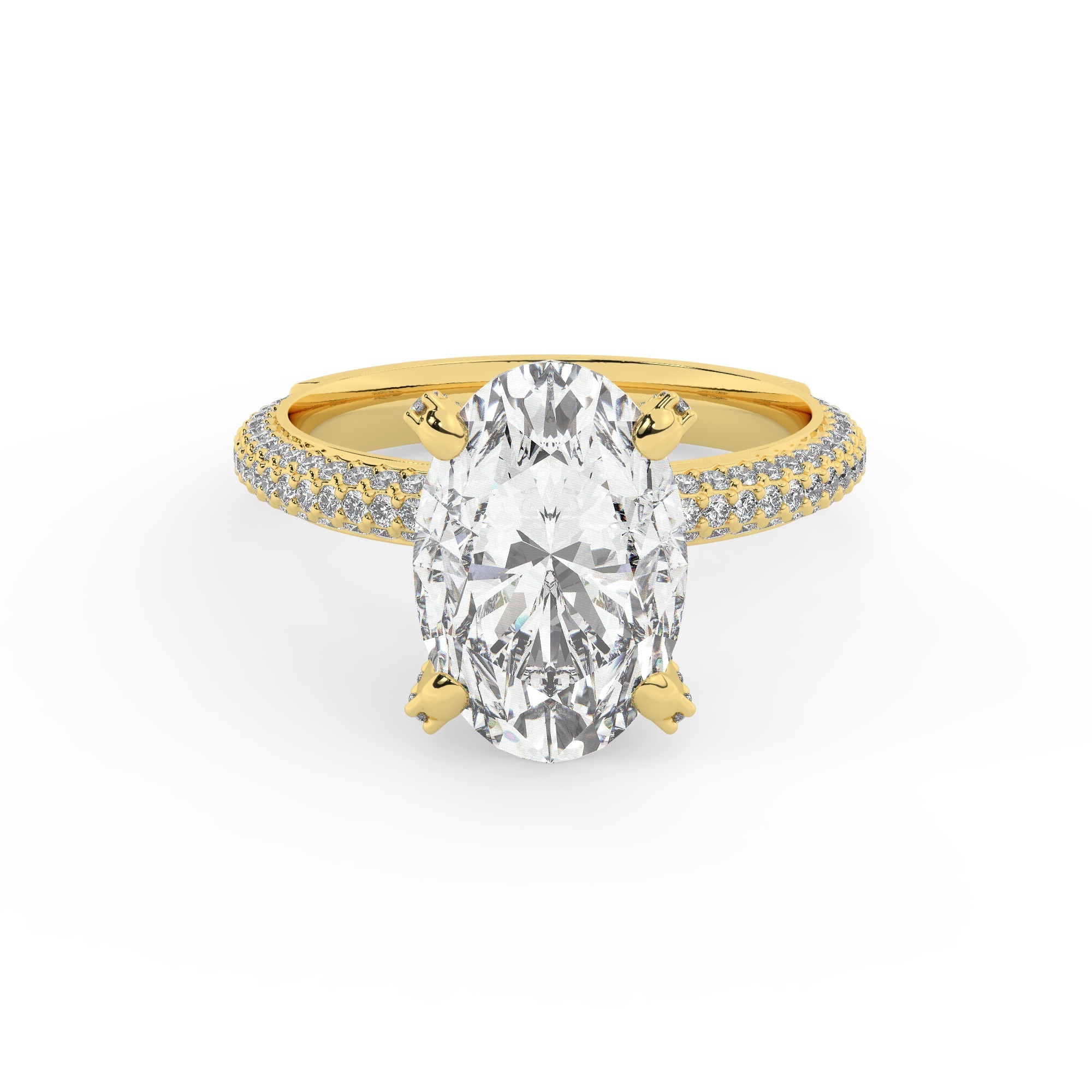 טבעת אירוסין מהממת בסגנון סוליטר עם יהלומים בצדדים, עשויה כסף מצופה זהב צהוב, עם אבן מרכזית בצורת אובל באיכות גבוהה ביותר. כולה עטופה בניצוץ יוקרתי עם 117 אבני זירקוניה במשקל כולל של 3.40 קראט.