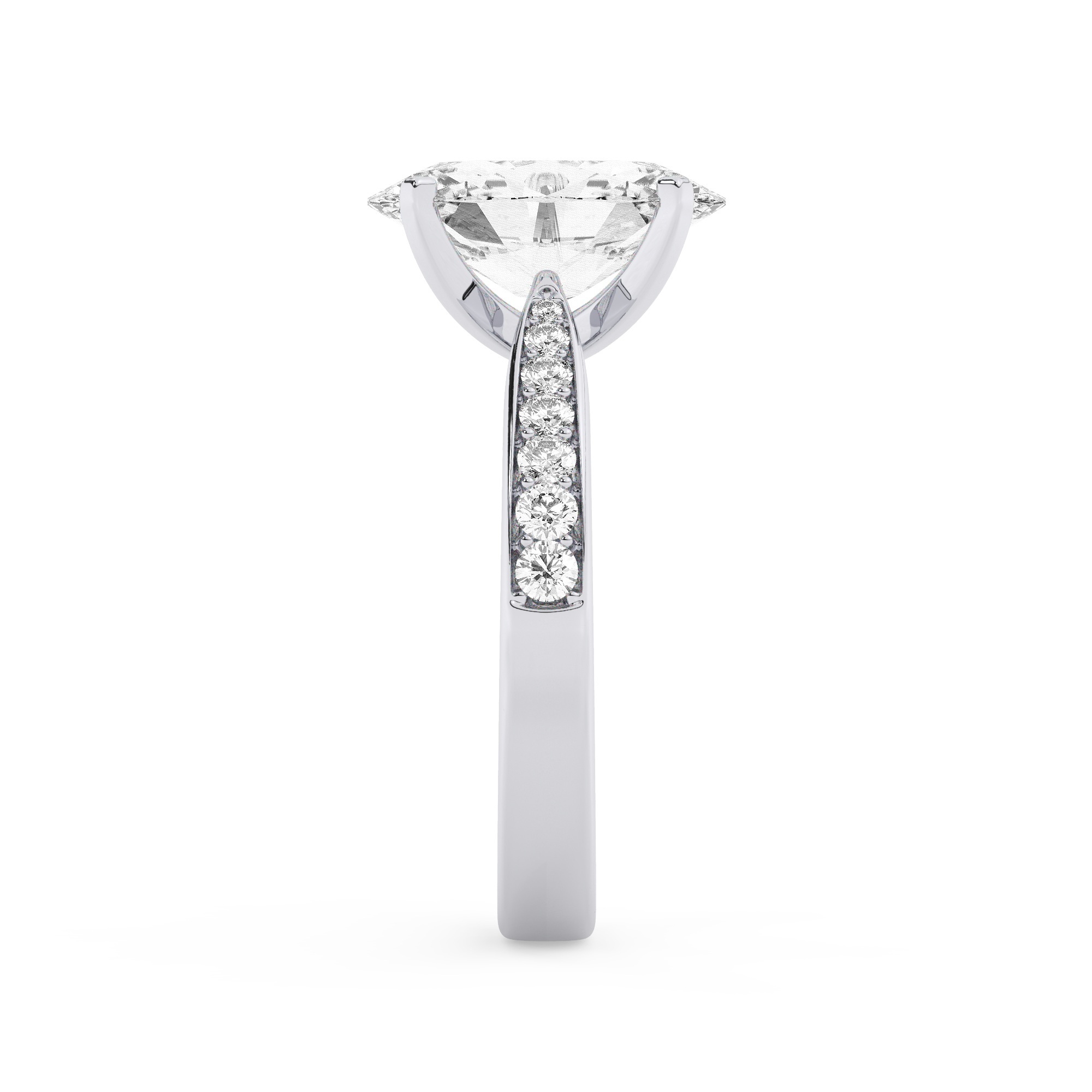 האבן המרכזית של הטבעת, זירקוניה באורך של 4 קראט, מבהקת באור ייחודי המלהיב את הלב ומושך כל מבט. צורתה האובלית מספקת לה מראה מאוד מתוחכם ומודרני. האבנים הקטנות בסביבתה, כל 14 אבנים שמוסיפות 0.15 קראט, מעצימות את הכוח הויזואלי של הטבעת והופכות אותה למרכז תשומת הלב.