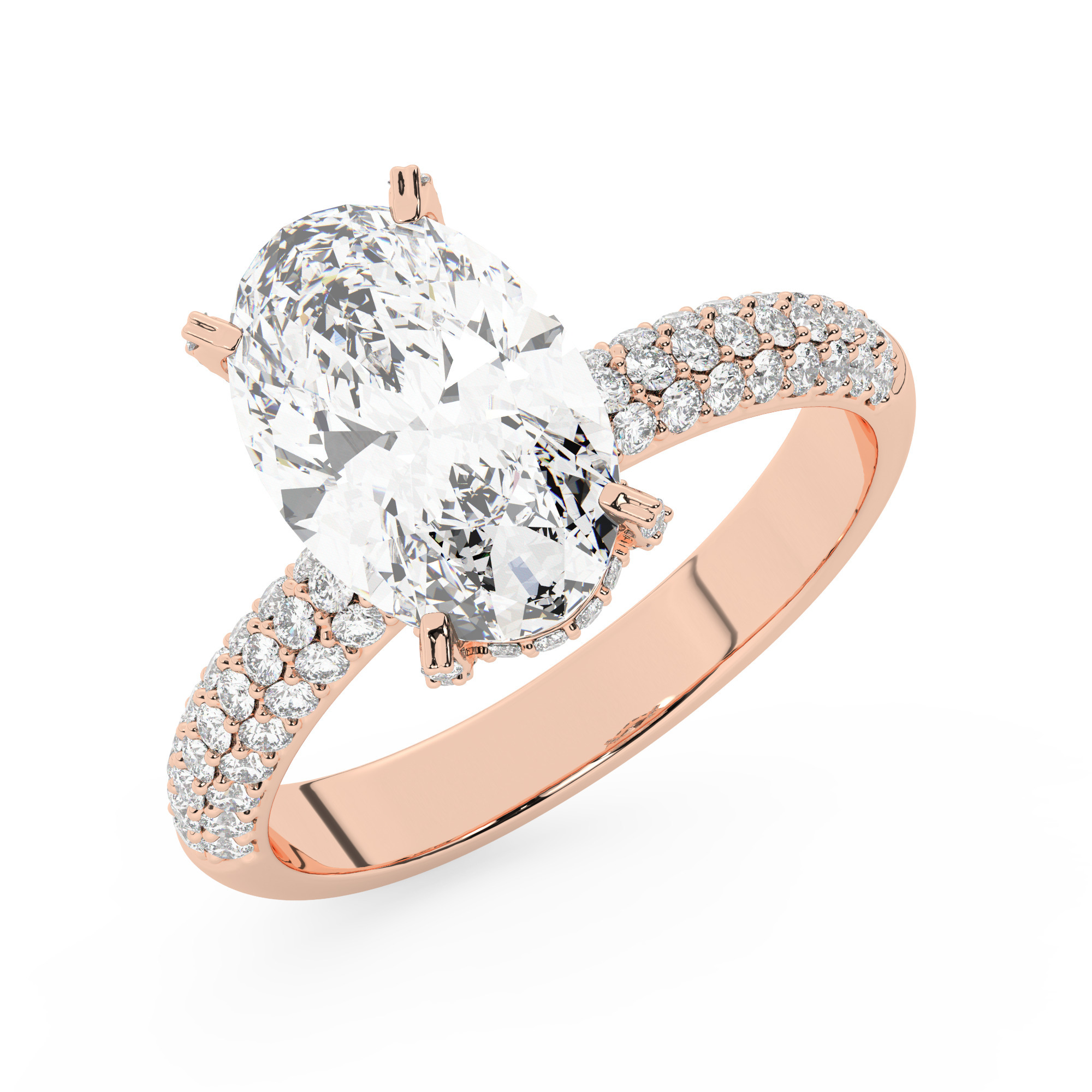 טבעת אירוסין מרהיבה בעיצוב סוליטר קלאסי עם שיבוץ 101 אבני זירקוניה מנצנצות. עשויה מכסף מצופה זהב אדום (רוזגולד), אבן מרכזית גדולה במשקל 5 קראט, בצורת אובל בצבע D וניקיון VVS1 עם תעודה גמולוגית.