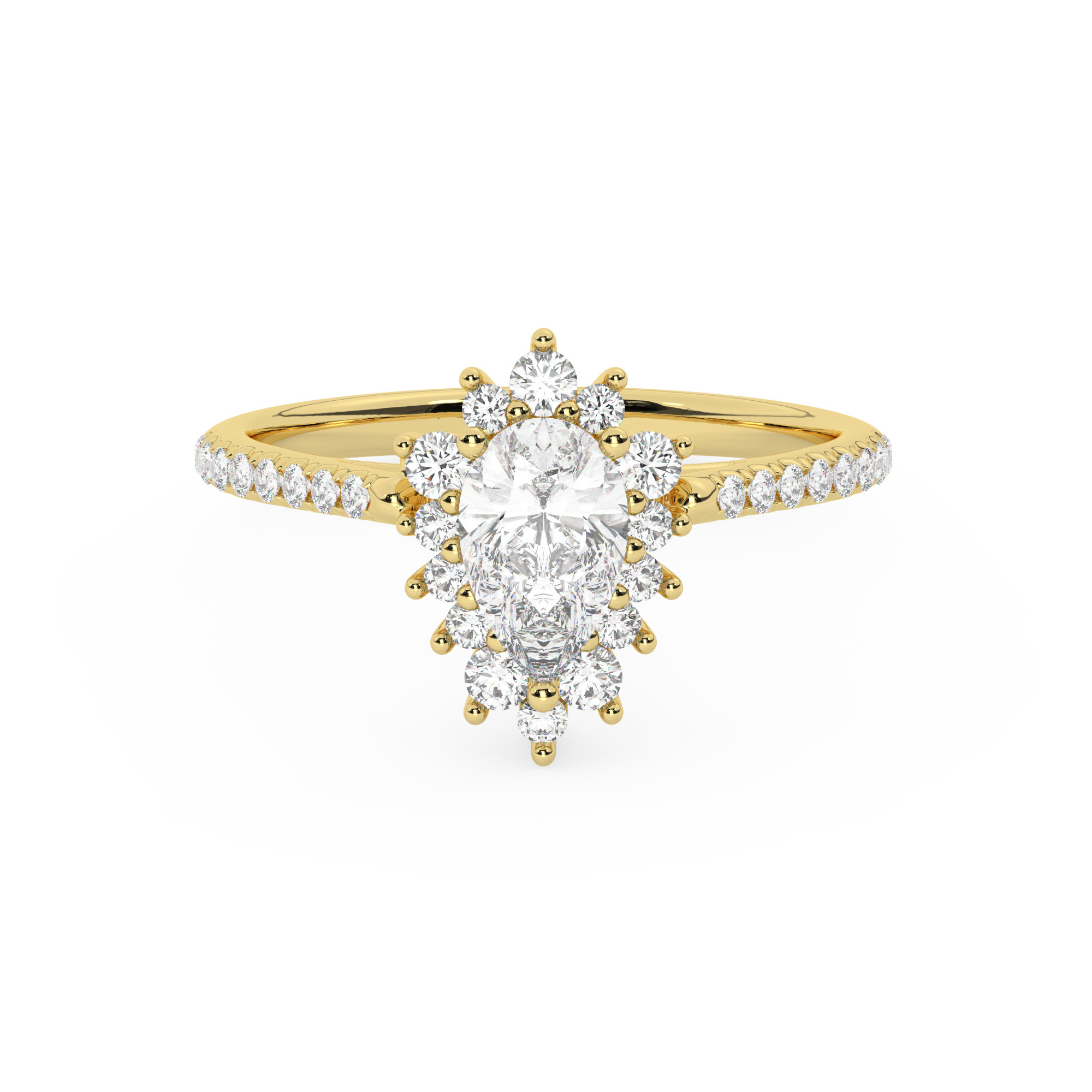 טבעת אירוסין היילו דגם 50024 זהב צהוב 14 קראט במרכז זירקוניה 2.50 קראט בחיתוך טיפה מסביב ובצדדים זירקונים בחיתוך עגול