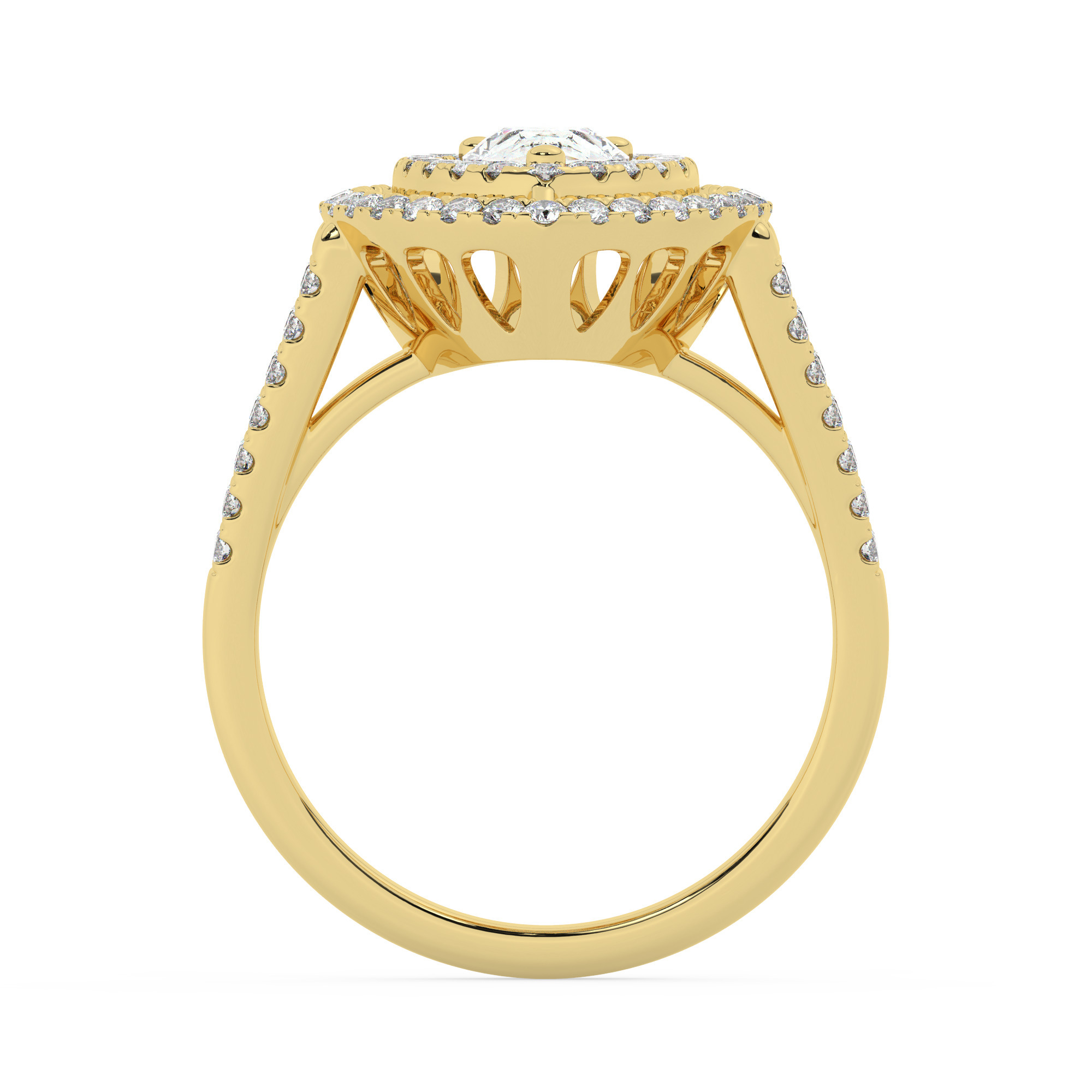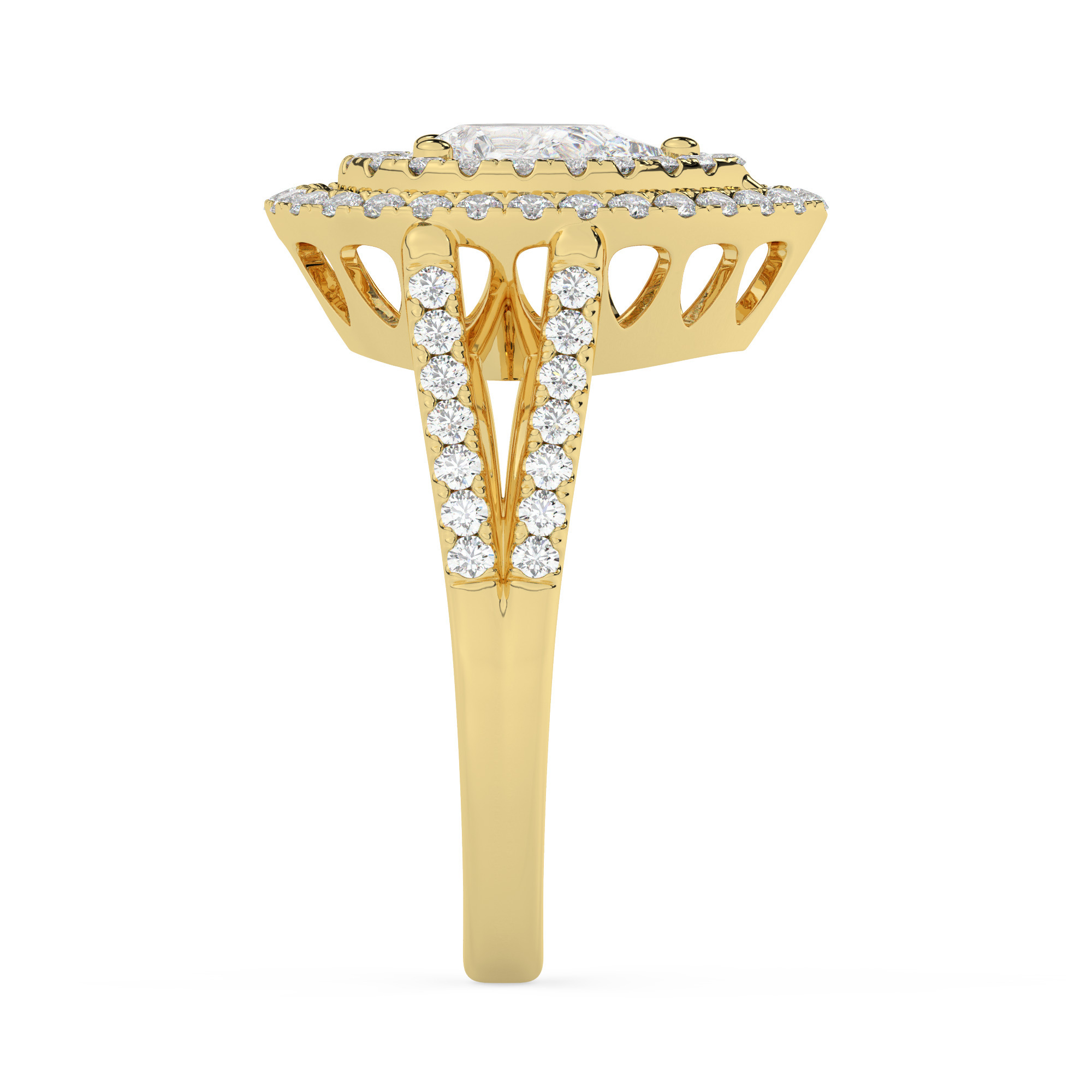 טבעת אירוסין היילו דגם 50025 כסף מצופה זהב צהוב במרכז זירקוניה 4 קראט בחיתוך טיפה מסביב ובצדדים זירקונים בחיתוך עגול