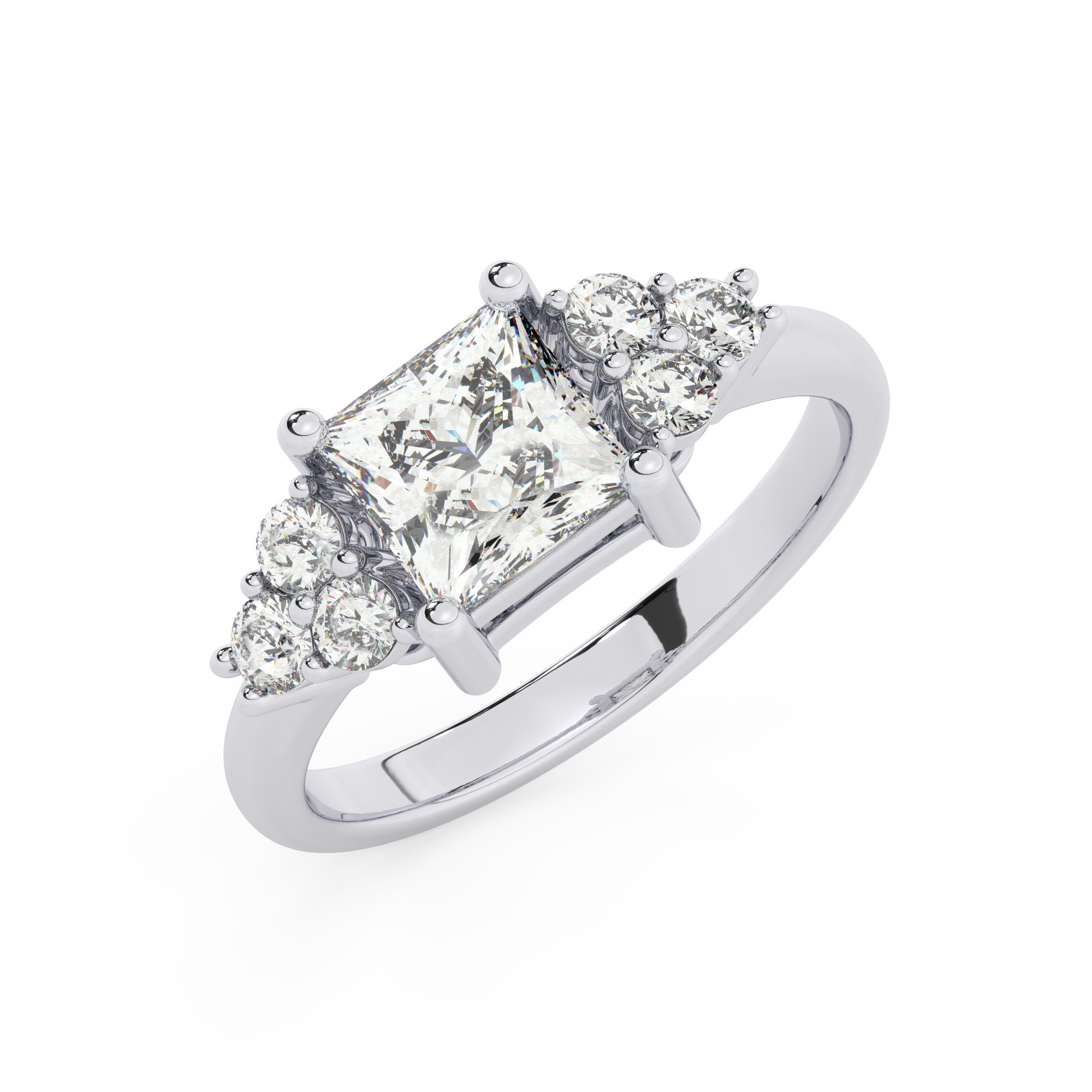 טבעת אירוסין סוליטר וזירקונים בצדדים דגם 50041 כסף מצופה זהב לבן במרכז זירקוניה 1.50 קראט בחיתוך פרינסס מסביב ובצדדים זירקונים בחיתוך עגול