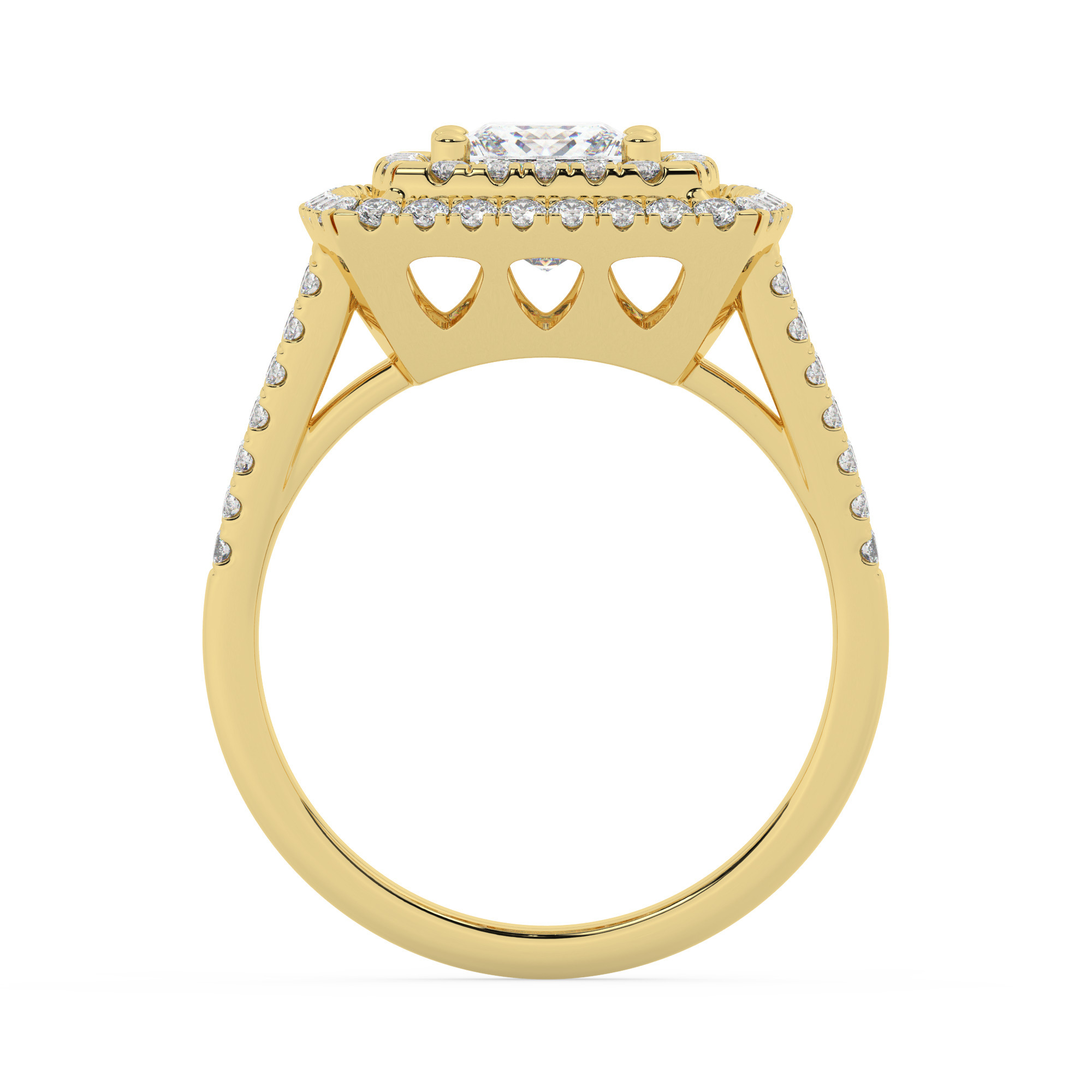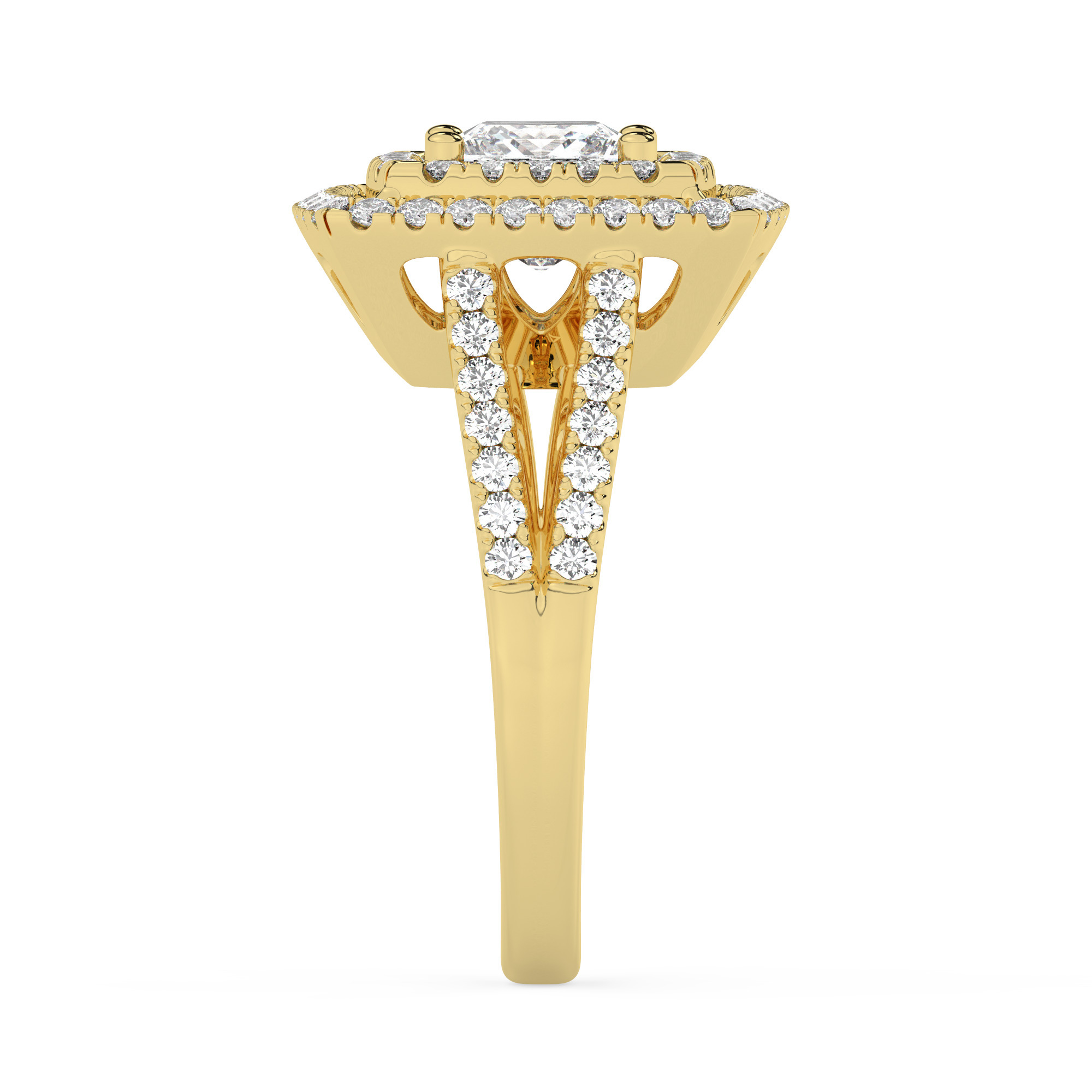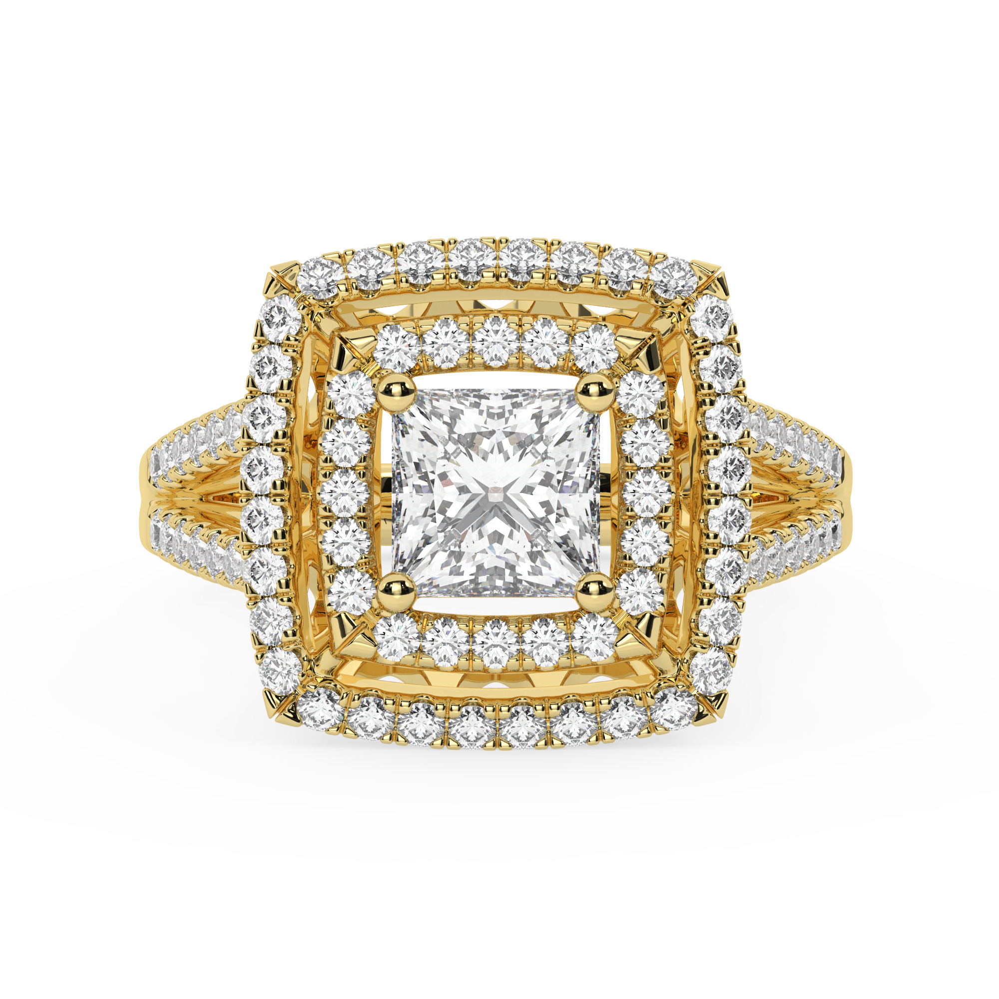 טבעת אירוסין היילו דגם 50025 זהב צהוב 14 קראט במרכז זירקוניה 2.50 קראט בחיתוך פרינסס מסביב ובצדדים זירקונים בחיתוך עגול