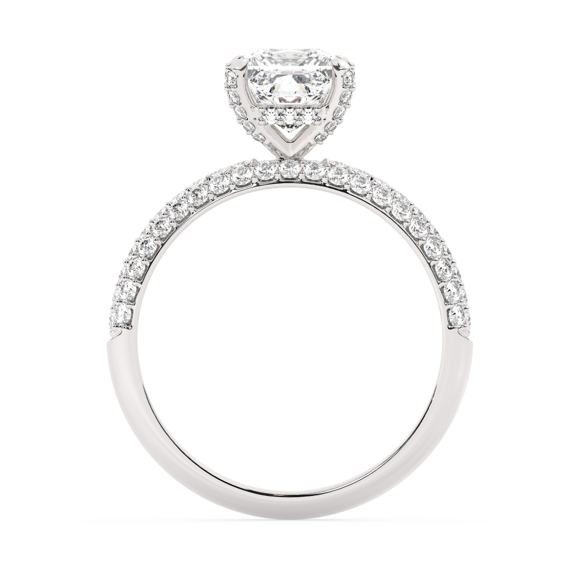 טבעת אירוסין מרהיבה בסגנון סוליטר עם יהלומים בצדדים, עשויה מכסף מצופה זהב לבן ומשובצת 101 אבני זירקוניה באיכות גבוהה. האבן המרכזית במשקל 4 קראט בצורת פרינסס ובצבע D הנדיר תשאיר רושם עוצמתי לנצח.