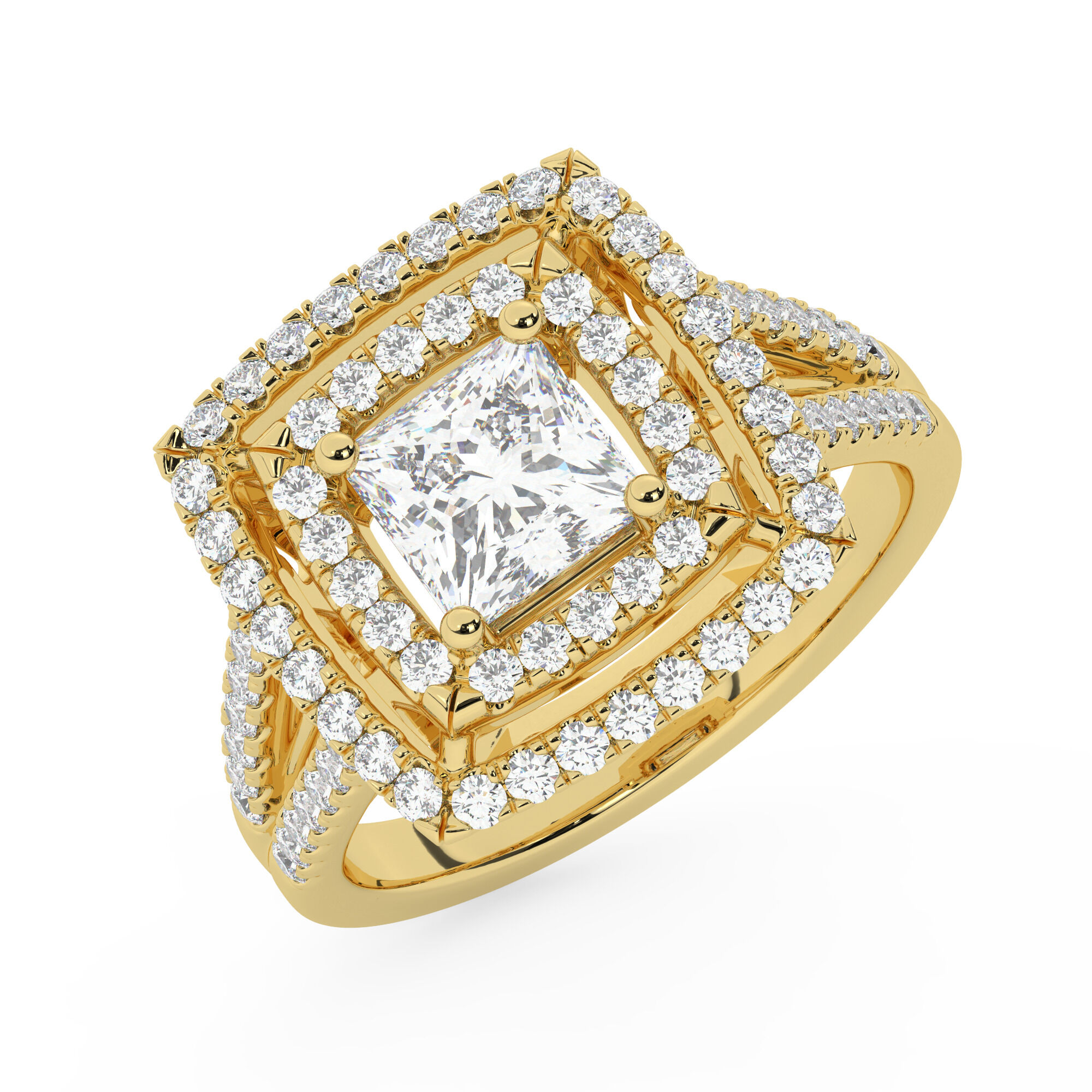 טבעת אירוסין היילו דגם 50025 כסף מצופה זהב צהוב במרכז זירקוניה 4 קראט בחיתוך פרינסס מסביב ובצדדים זירקונים בחיתוך עגול