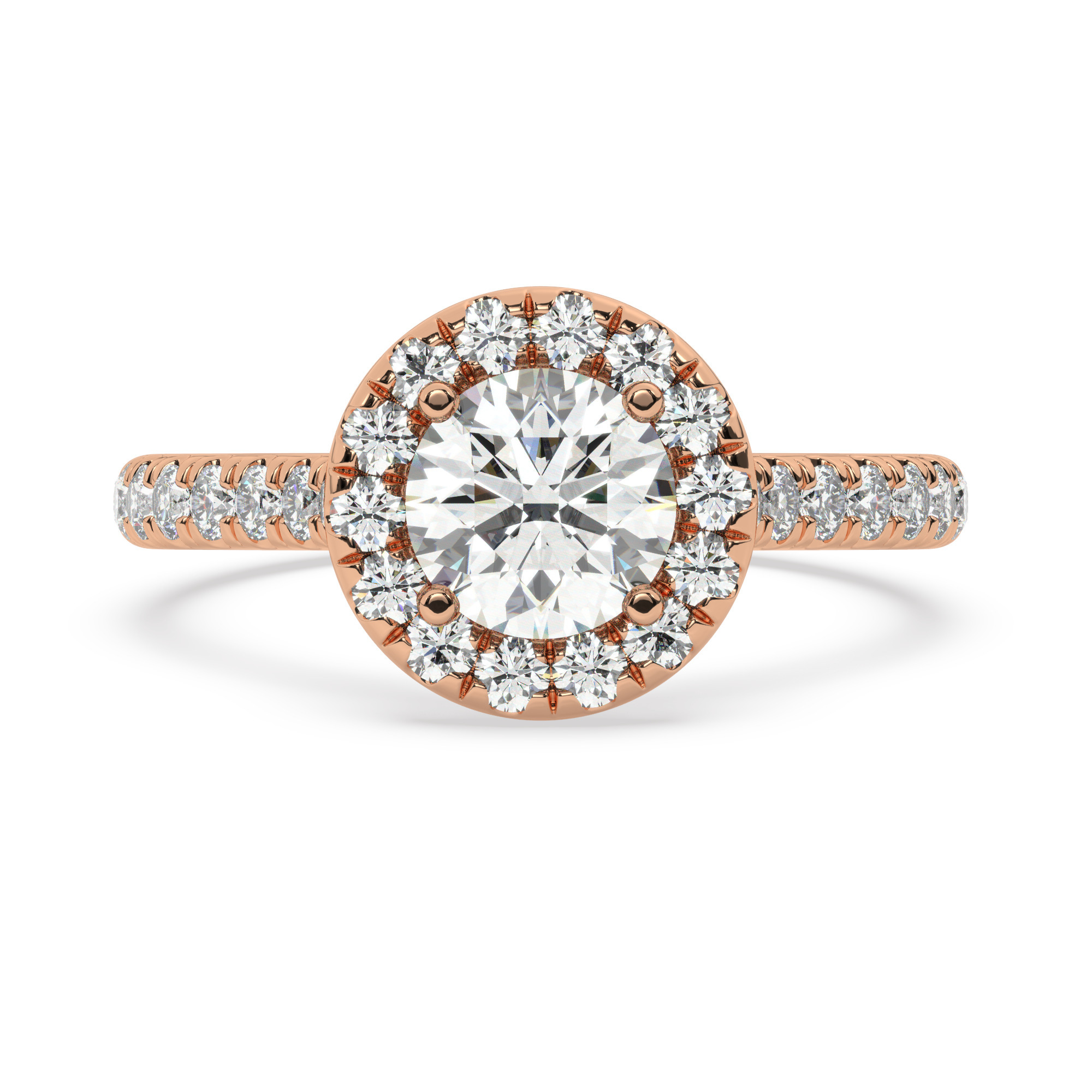 טבעת אירוסין היילו דגם 50026 זהב אדום רוזגולד 14 קראט במרכז זירקוניה 1 קראט בחיתוך עגול מסביב ובצדדים זירקונים בחיתוך עגול