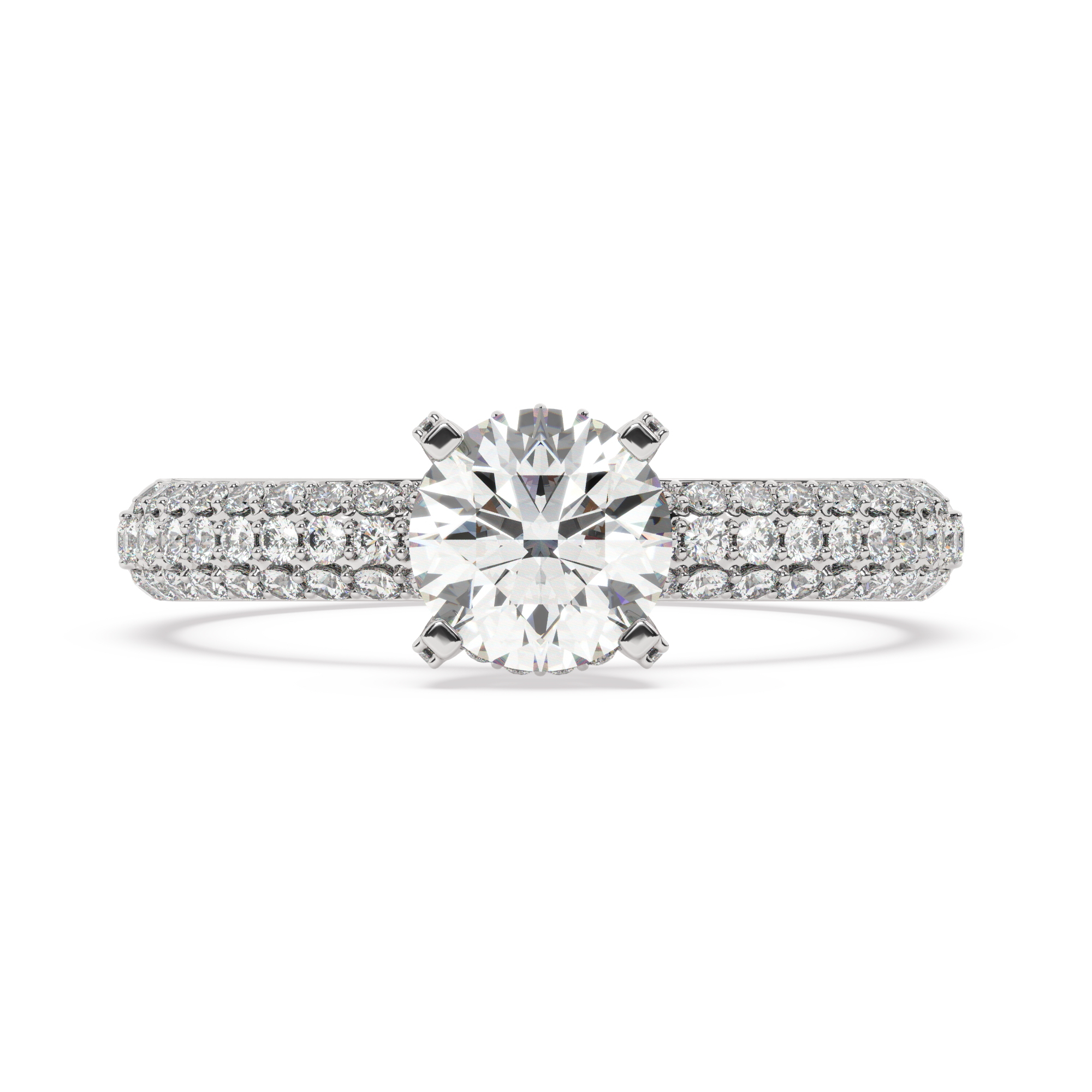 טבעת אירוסין מרהיבה בסגנון סוליטר עם יהלומים בצדדים, עשויה זהב לבן 14 קראט. משובצת 101 אבני זירקוניה נוצצות במשקל כולל של 1.50 קראט, כאשר האבן המרכזית היא זירקוניה עגולה ואיכותית במשקל 1 קראט, צבע D וניקיון VVS1.