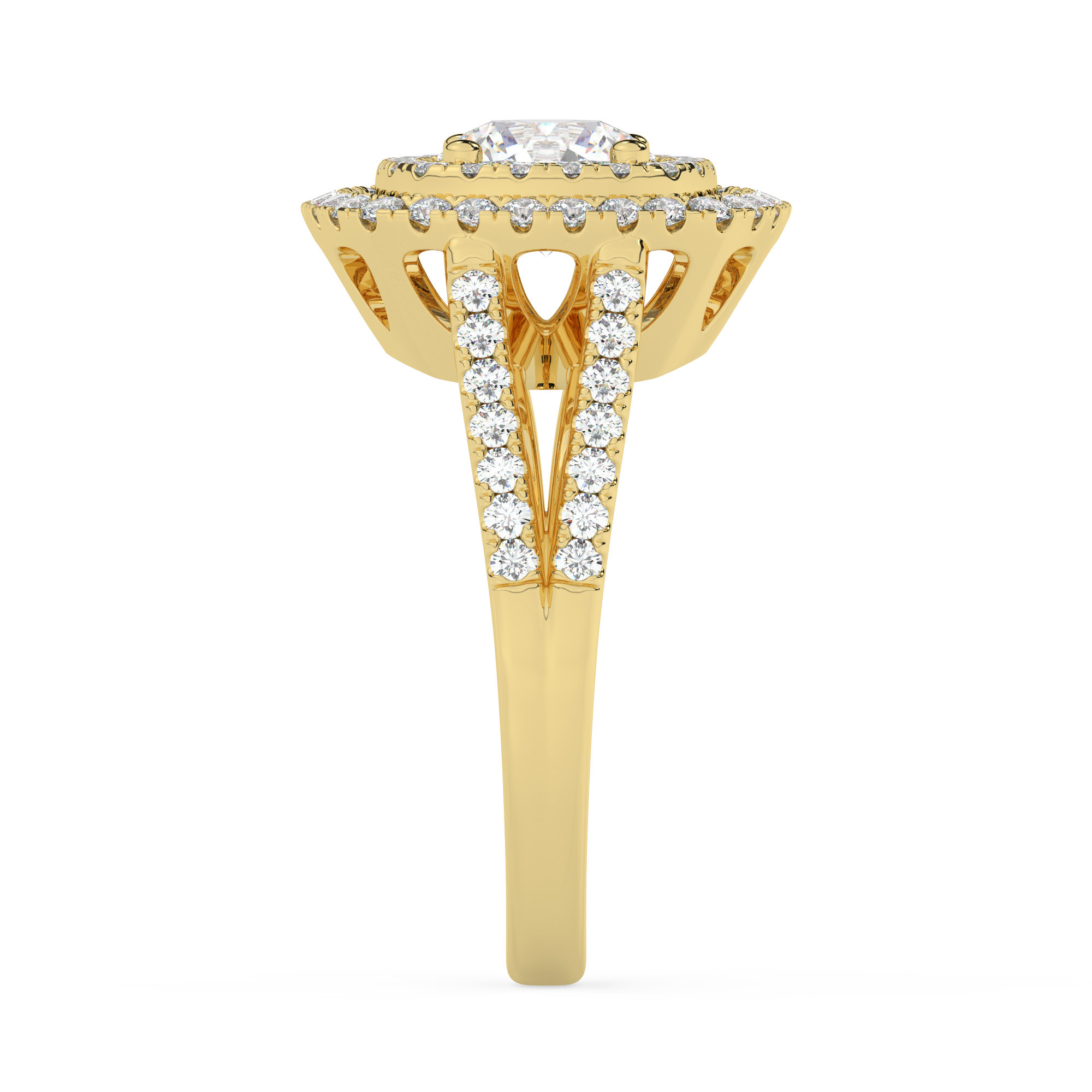 50% הנחהטבעת אירוסין היילו דגם ליטל זהב צהוב 14 קראט במרכז אבן מעבדה מוסונייט 1 קראט מסביבה ובצדדים שורה של אבני מעבדה עם תעודה גמולוגית בינלאומית GRA