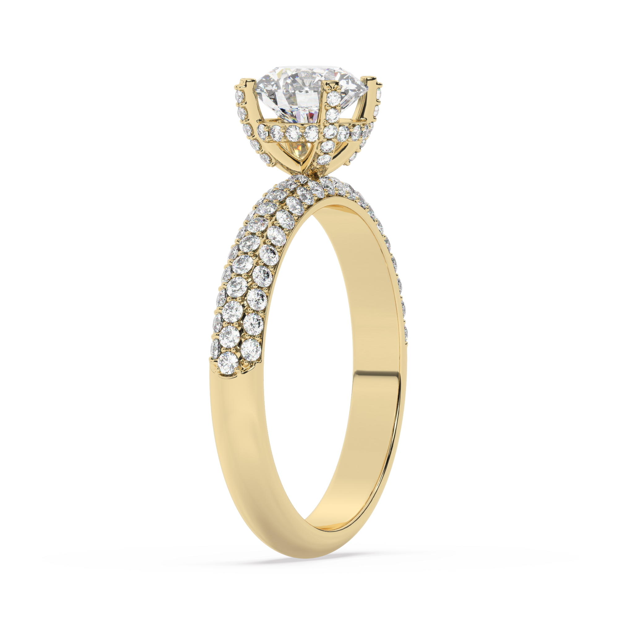 טבעת אירוסין סוליטר יוקרתית עשויה זהב צהוב 14 קראט, עם זירקוניה מרכזית במשקל 1.50 קראט ותוספת של 100 אבני צד מנצנצות. הטבעת משלבת עיצוב קלאסי עם נוכחות מרשימה ויוקרתית.