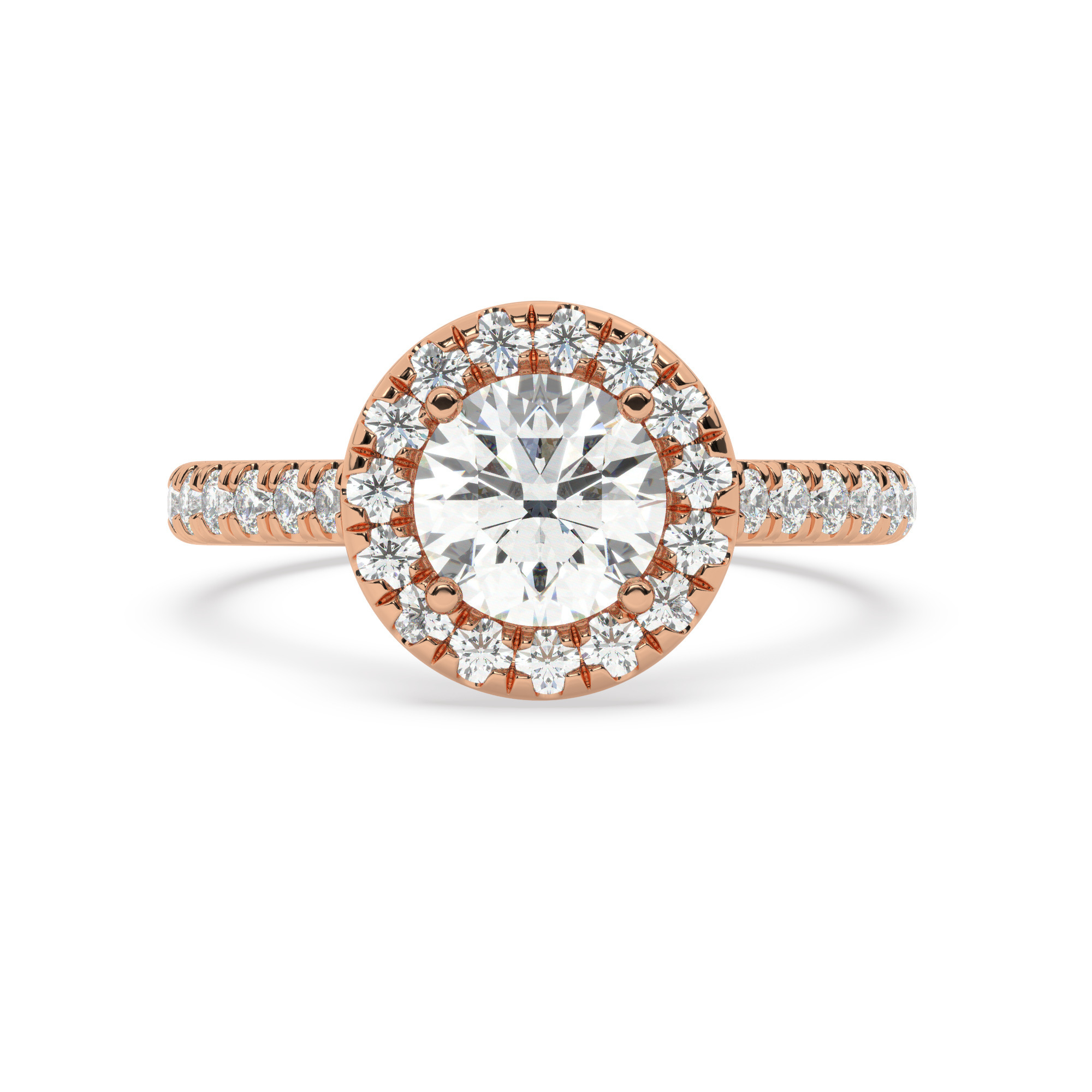 טבעת אירוסין היילו דגם 50026 כסף מצופה זהב אדום רוזגולד במרכז זירקוניה 1.50 קראט בחיתוך עגול מסביב ובצדדים זירקונים בחיתוך עגול