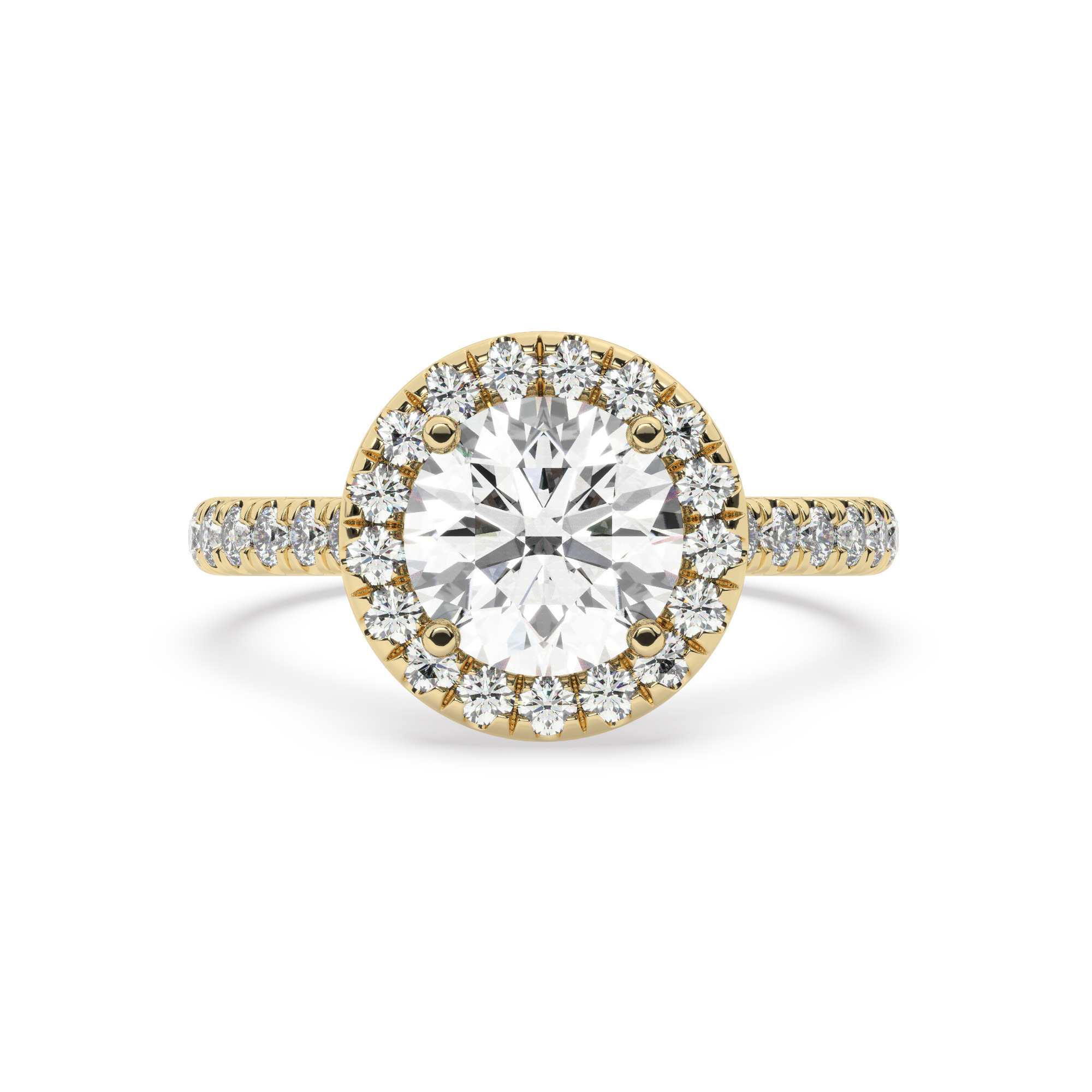 טבעת אירוסין היילו דגם 50026 כסף מצופה זהב צהוב במרכז זירקוניה 2 קראט בחיתוך עגול מסביב ובצדדים זירקונים בחיתוך עגול