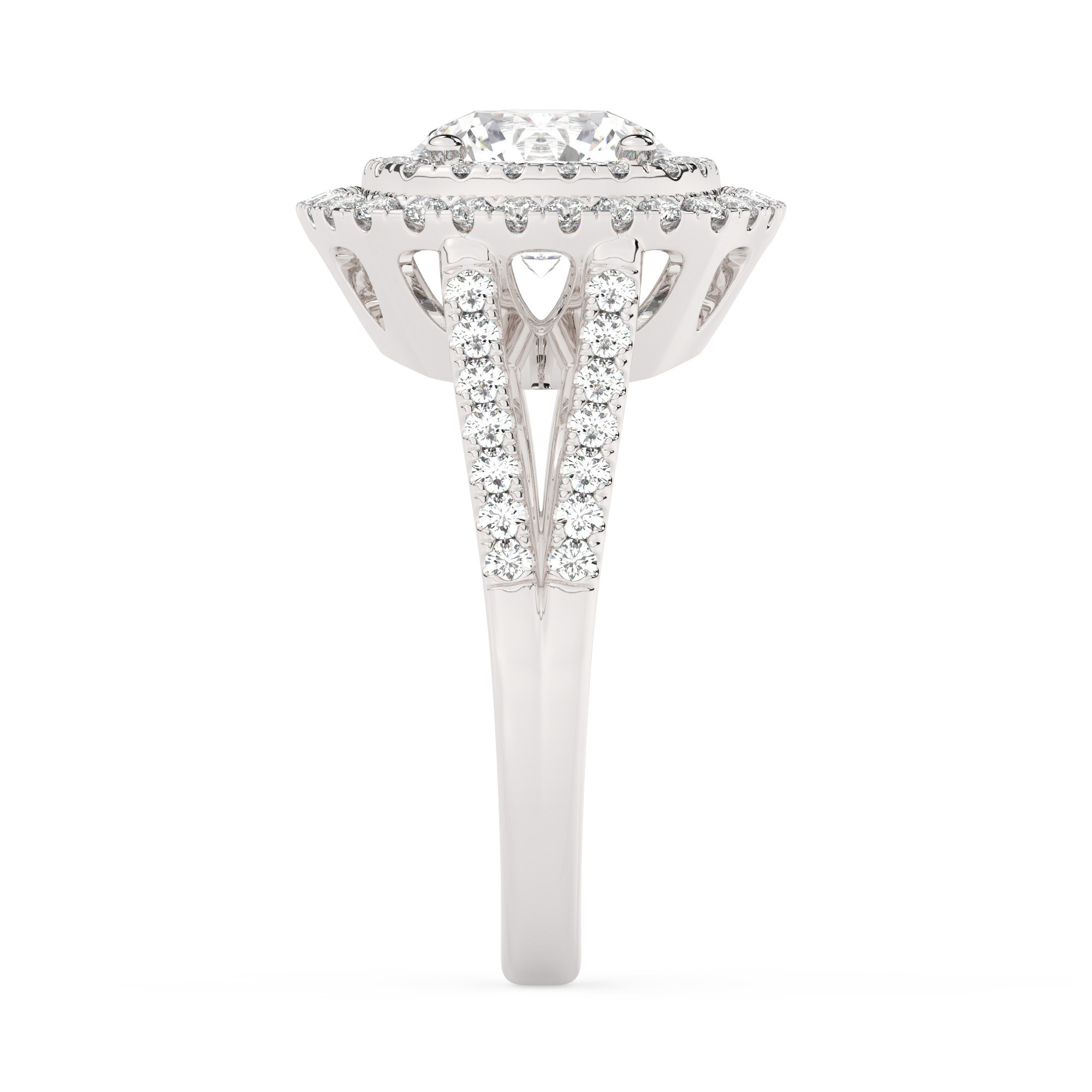 טבעת אירוסין היילו דגם 50025 כסף מצופה זהב לבן במרכז זירקוניה 2.50 קראט בחיתוך עגול מסביב ובצדדים זירקונים בחיתוך עגול