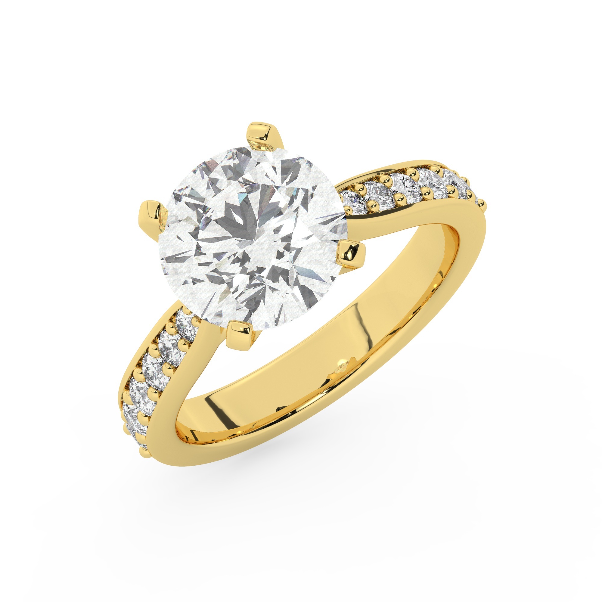 טבעת אירוסין סוליטר וזירקונים בצדדים דגם 50017 כסף מצופה זהב צהוב במרכז זירקוניה 2.50 קראט בחיתוך עגול מסביב ובצדדים זירקונים בחיתוך עגול